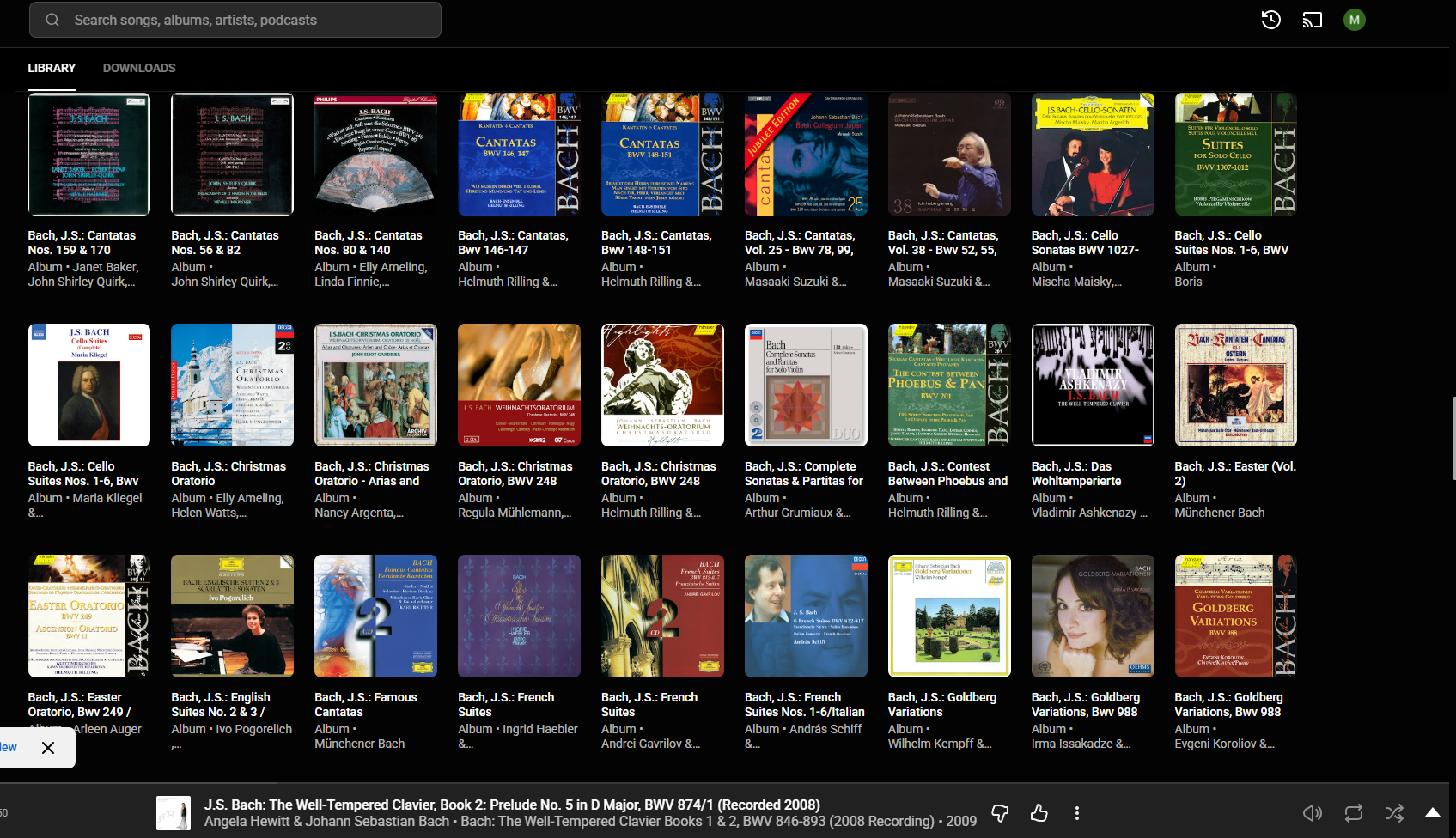 >>128191514>I've never used those libraries, so I don't know how they function, but can't you just scroll down and ctrl+f?I used to do that in the first few months when my library size was only in the few hundreds, but as it's grown to an unmanageable size, that's not really practical because the library is in an album cover view, and only loads a bit at a time, so you'd have to scroll down for quite a while in my case to get the entire library available on a single page to be properly ctrl-f'd if you get me. In hindsight, perhaps I should have been more discriminatory in the albums I added to my library, but like I said, it's a useful way to track recordings I'm interested in and want to listen to in the near future, particularly when viewing the library sorted by Recently Saved. Pic is sorted by A-Z and scrolled down a bit into the Bach section lol. So for searching through my Bach, it'd be useful since it'd load pretty early on, but getting to anything which starts with a letter in the middle of the alphabet would be unpractical this way, plus not everything is sorted probably (you'll notice in the pic these recordings start "Bach, JS: [Piece]", but sometimes it'll just be "[piece]" like "Goldberg Variations" or it'll be "JS Bach: Piece", etc.)In any case, thanks for taking the time to read about something as uninteresting as the finer functions of a streaming service you don't use lol.
