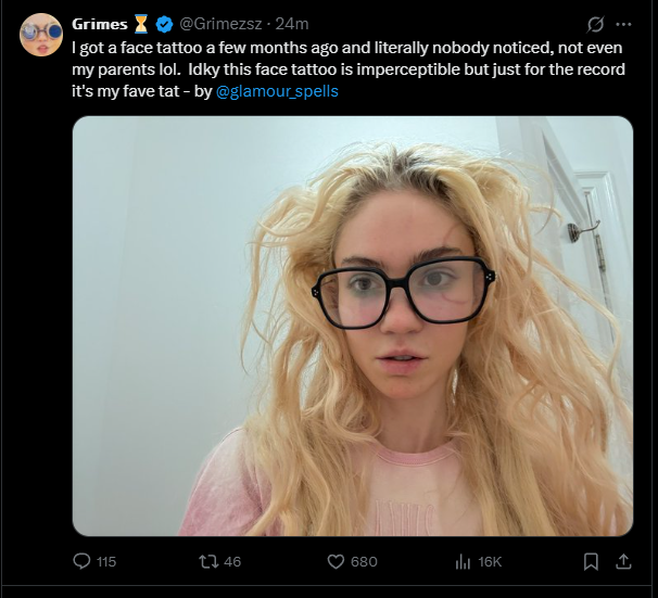 >>128190063imagine being the bastard child of the richest man in the world. Wouldn't care much if mom got a face tattoo.Besides, Grimes makes occasionally good music.
