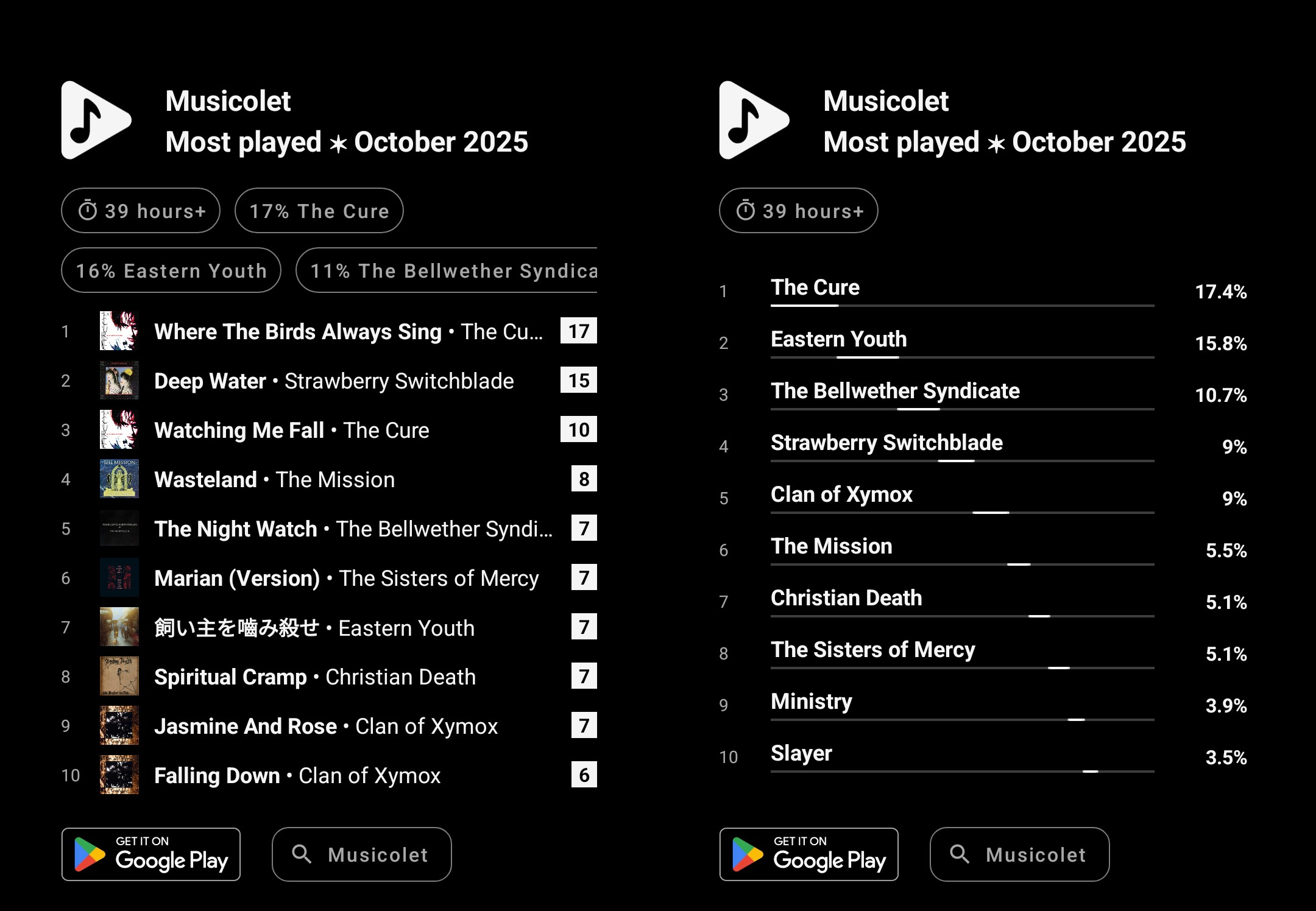 >>128263394I had Cacophony from Rudimentary Peni on Bandcamp. That doesn't get counted in Musicolet. I've also been listening to The Mob which sadly isn't on my phone; sought it out via YouTube.