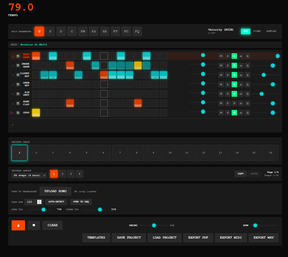 Going from "working at first glance" and actually being useful / reliable has been a challenge, but now I can say most everything that is present in the app works as expected.Biggest issues I was having was getting the midi / wav exports to properly include all of the paramater automations / edits, but it's all working now.Today I'm focusing on breaking out the transcription mode into a more focused panel, and improving those features specifically. _then_ I will add song / arrangement mode.Already I get a lot of use out of this as just something to play samples with on my MIDI keyboard. I can just load up the sample bank on another tab and noodle. It's also really fun to use on a tablet / phone.Nothing special, just me validating swing, velocity, substeps and pitch changes all exported to wav properly : https://voca.ro/1aEg7PXhVwSK/blog