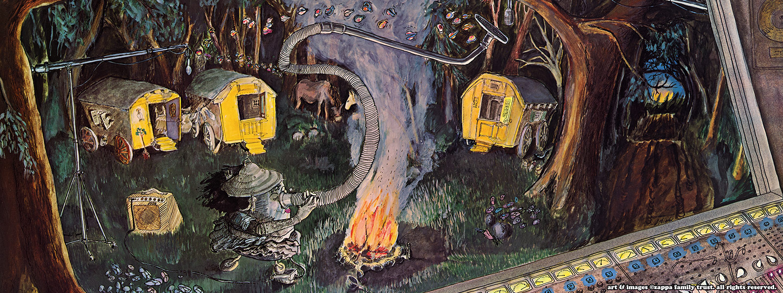 A Gypsy mutant industrial vacuum cleaner dances about a mysterious night time camp fire. Festoons. Dozens of imported castanets, clutched by the horrible suction of its heavy duty hose, waving with marginal erotic abandon in the midnight autumn air.