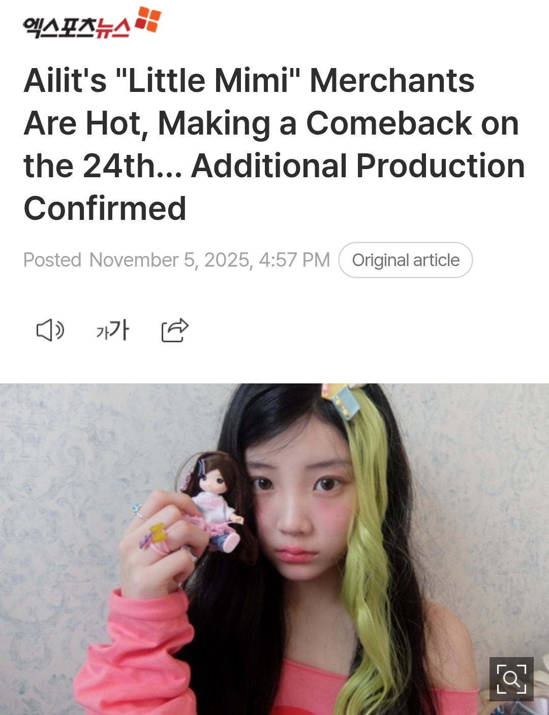 ILLIT's little mimi collab albums were completely sold out shortly after the pre-order period started, prompting Belift lab to order the production of more dolls.https://m.entertain.naver.com/home/article/311/0001938445Previously, ILLIT's bomb album that came with in-ear monitors was also well received, and their merch is popular with "trendy" girls in korea