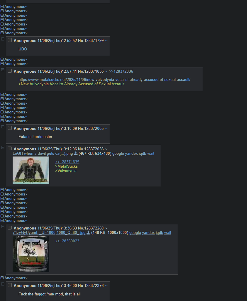 >>128369064If you're referring to /trad/ that's just babies that don't like most people talking about extreme metal here.