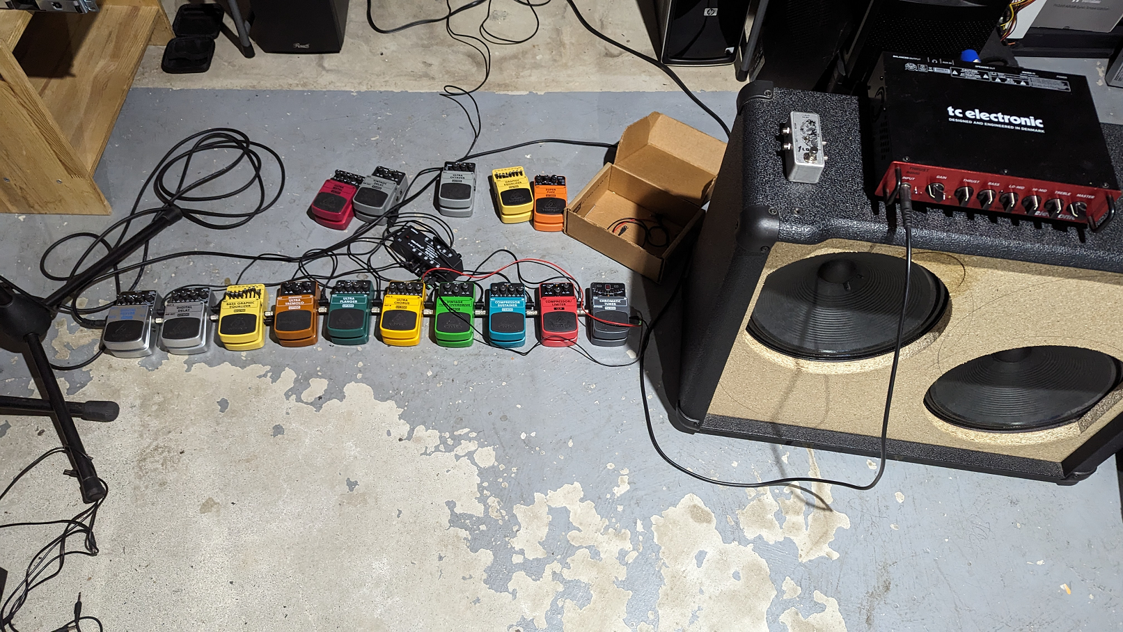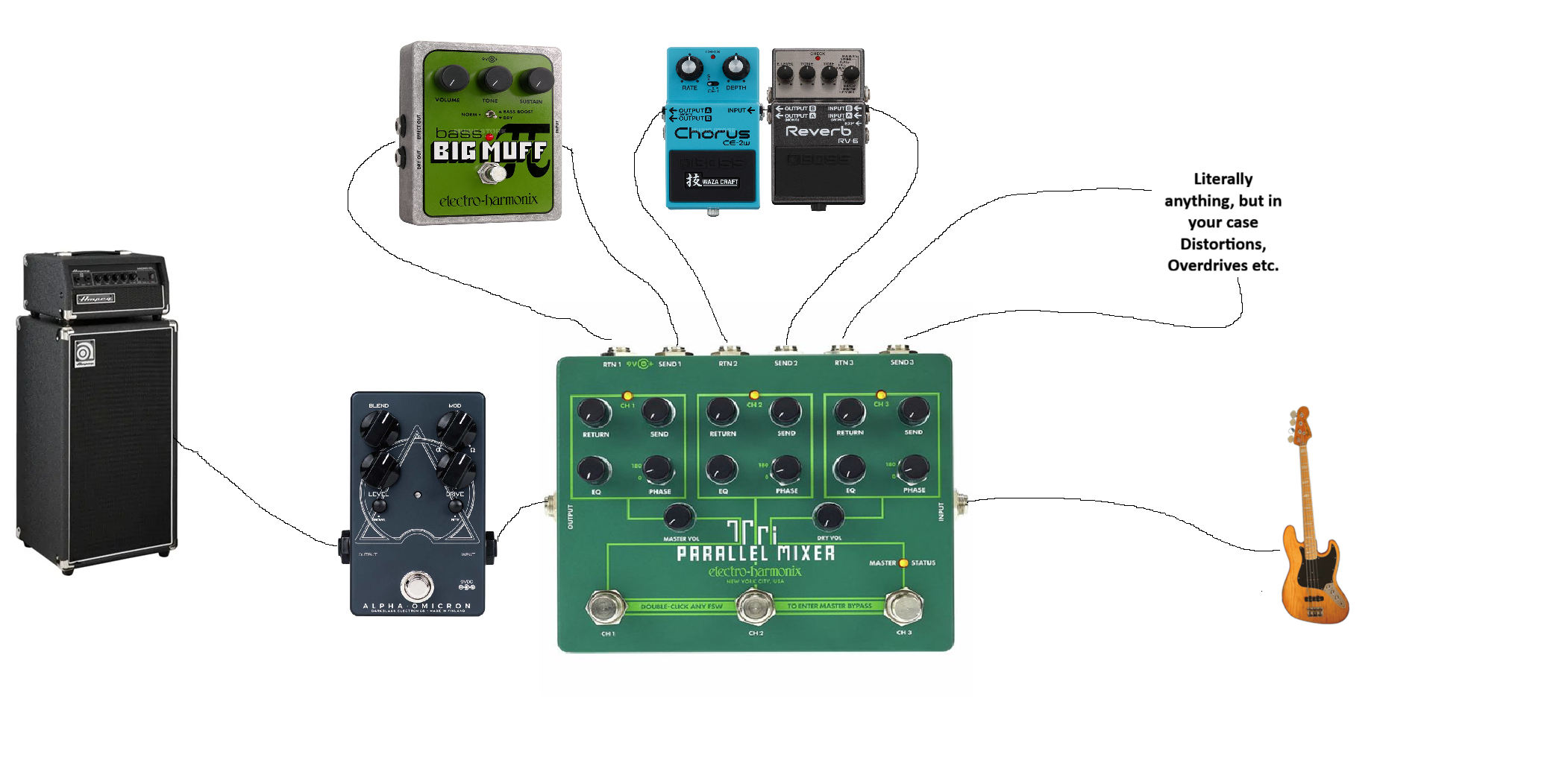 This is the best setup so far the pedals. I think i might drop both the reverb and chorus. I dont really know how either would fit into noise rock or sludge on bass. On guitar those effects would make sense. I wish my fucking tronographic was here but it's coming from Japan.