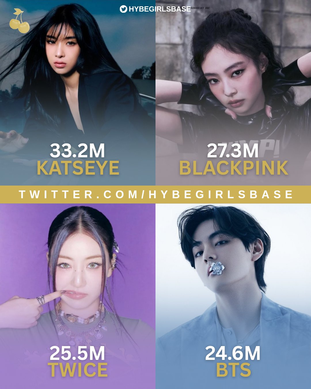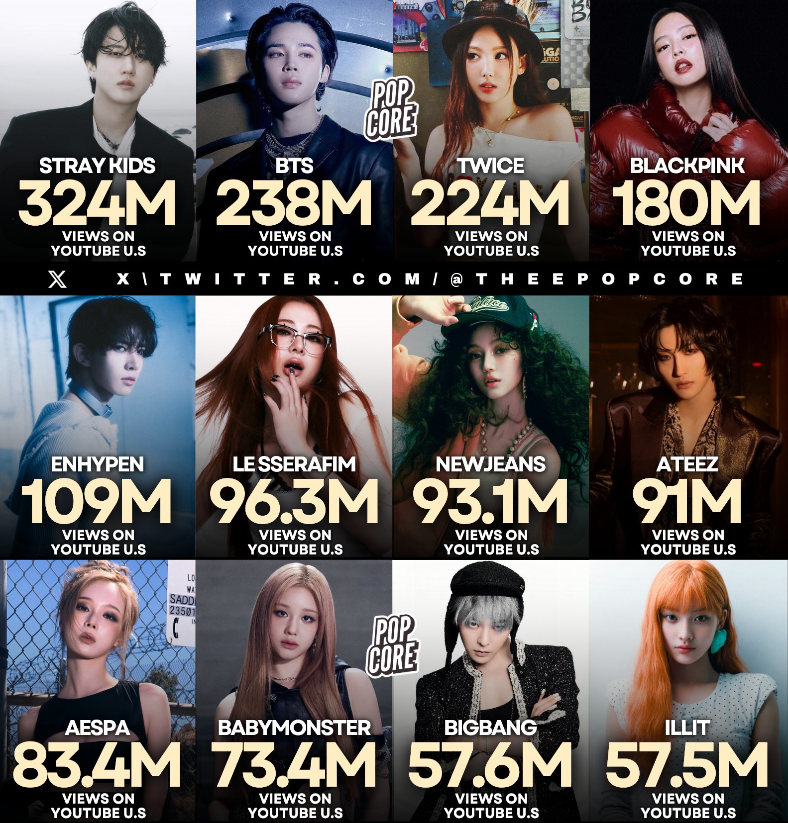 >>128466175>>128466173>>128466148>>128466205these comments force me to be numbers.i didn't want to do it, butBlackpink....................15,909,996,654TWICE........................11,154,588,019NewJeans.....................6,860,880,513Le Sserafim...................4,861,242,020Aespa............................4,636,206,194I-dle................................4,300,129,399Red Velvet......................3,727,854,563Itzy..................................3,169,216,953Ive...................................3,057,907,233>Katseye.........................1,744,546,370 (this American group is not kpop and included only for amusement)Babymonster...................1,661,955,449Fifty Fifty..........................1,606,271,810Mamamoo........................1,578,956,792AOA..................................1,575,439,918Illit......................................1,492,279,361SNSD.................................1,278,567,177XG.......................................1,280,256,907NMIXX..................................1,120,823,172Kiss of Life.............................1,072,006,238IZ*ONE...................................1,012,027,516data from Oct 2025