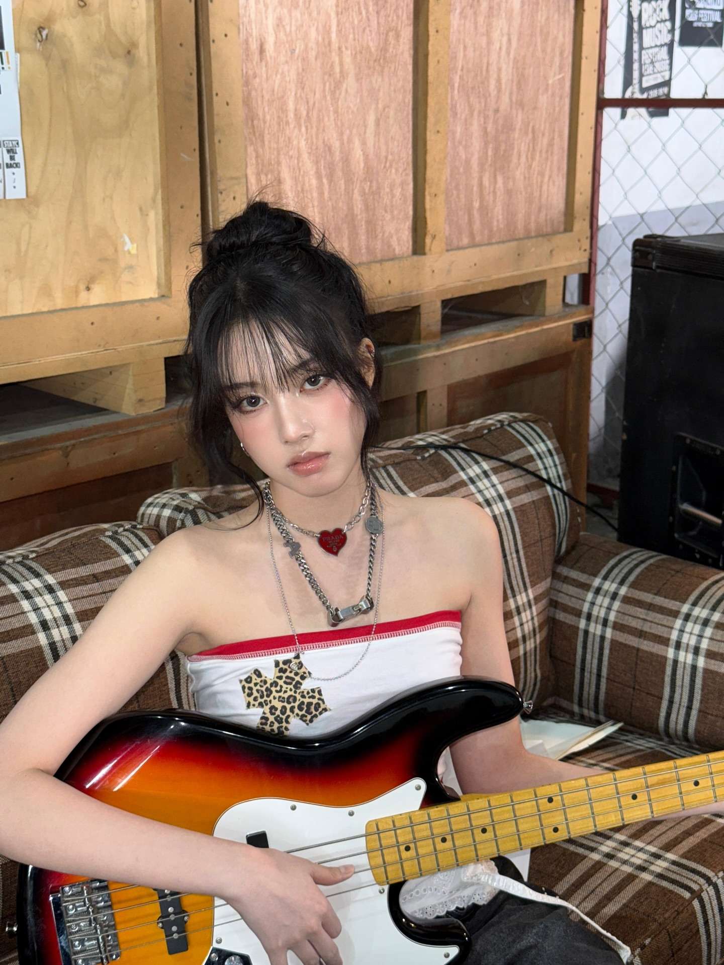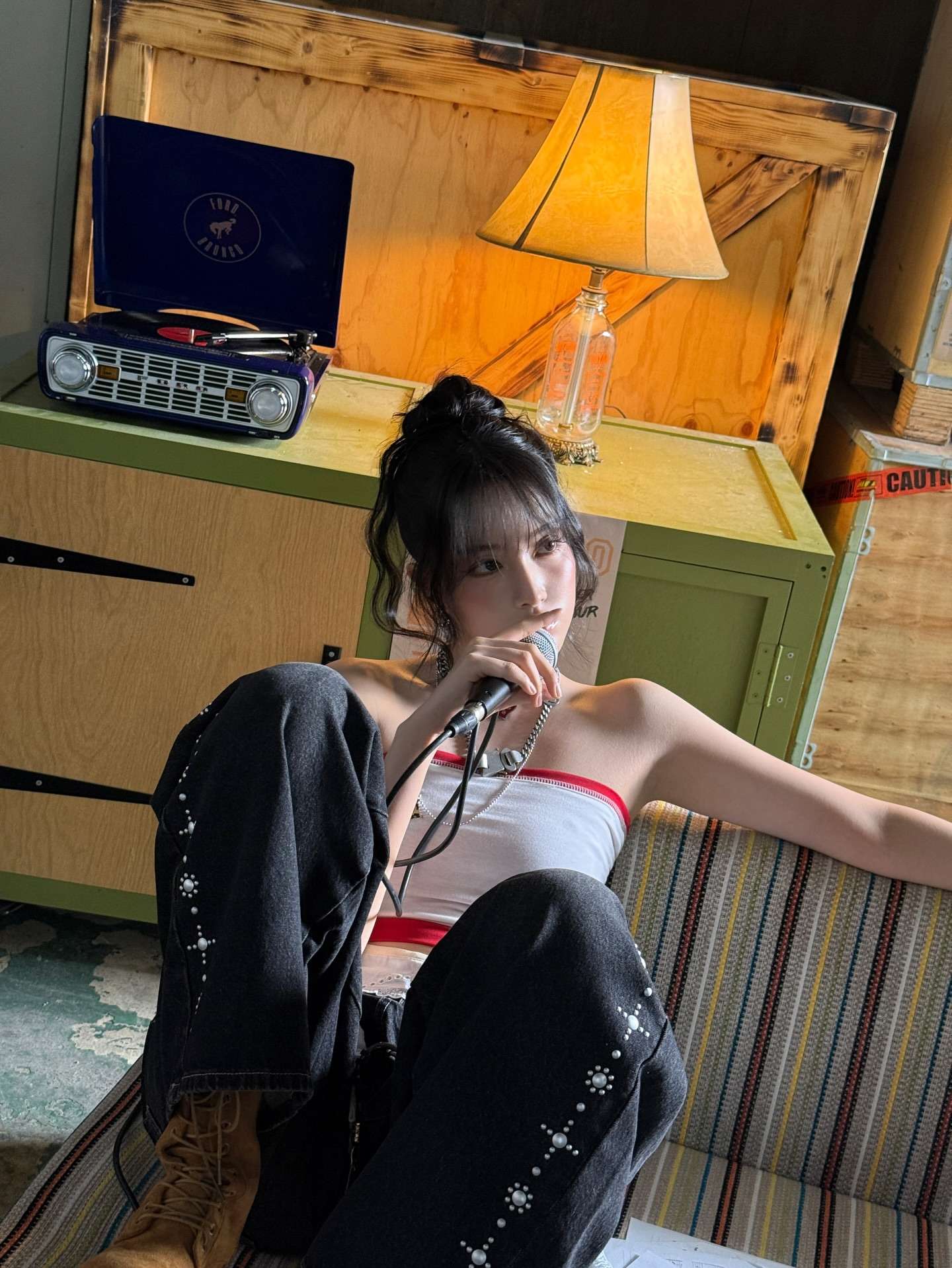 ian with her hair down, black mascara, a clip-on nose ring, a black and pink shirt with frilly laces on the sleeves, studded bracelet, black miniskirt, black and white striped stockings and studded boots while listening to underoath on her 256mb iriver mp3 player