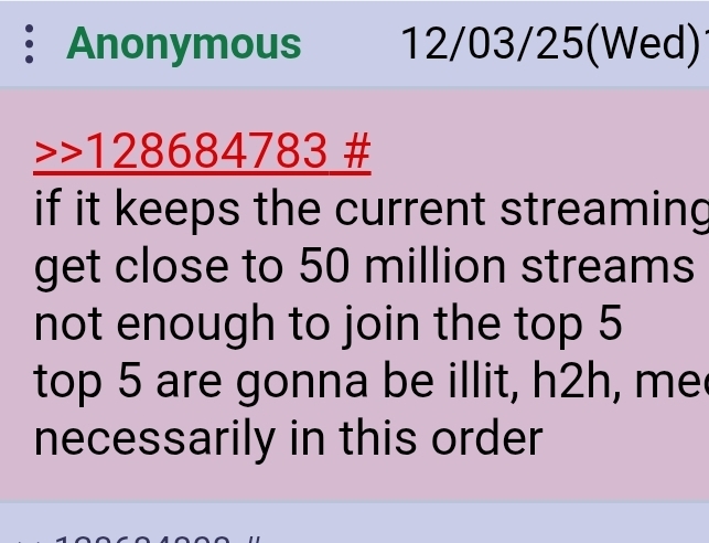 >>128684783if it keeps the current streaming numbers it could get close to 50 million streams by dec 31, but that's not enough to join the top 5top 5 are gonna be illit, h2h, meovv and cortis, not necessarily in this order