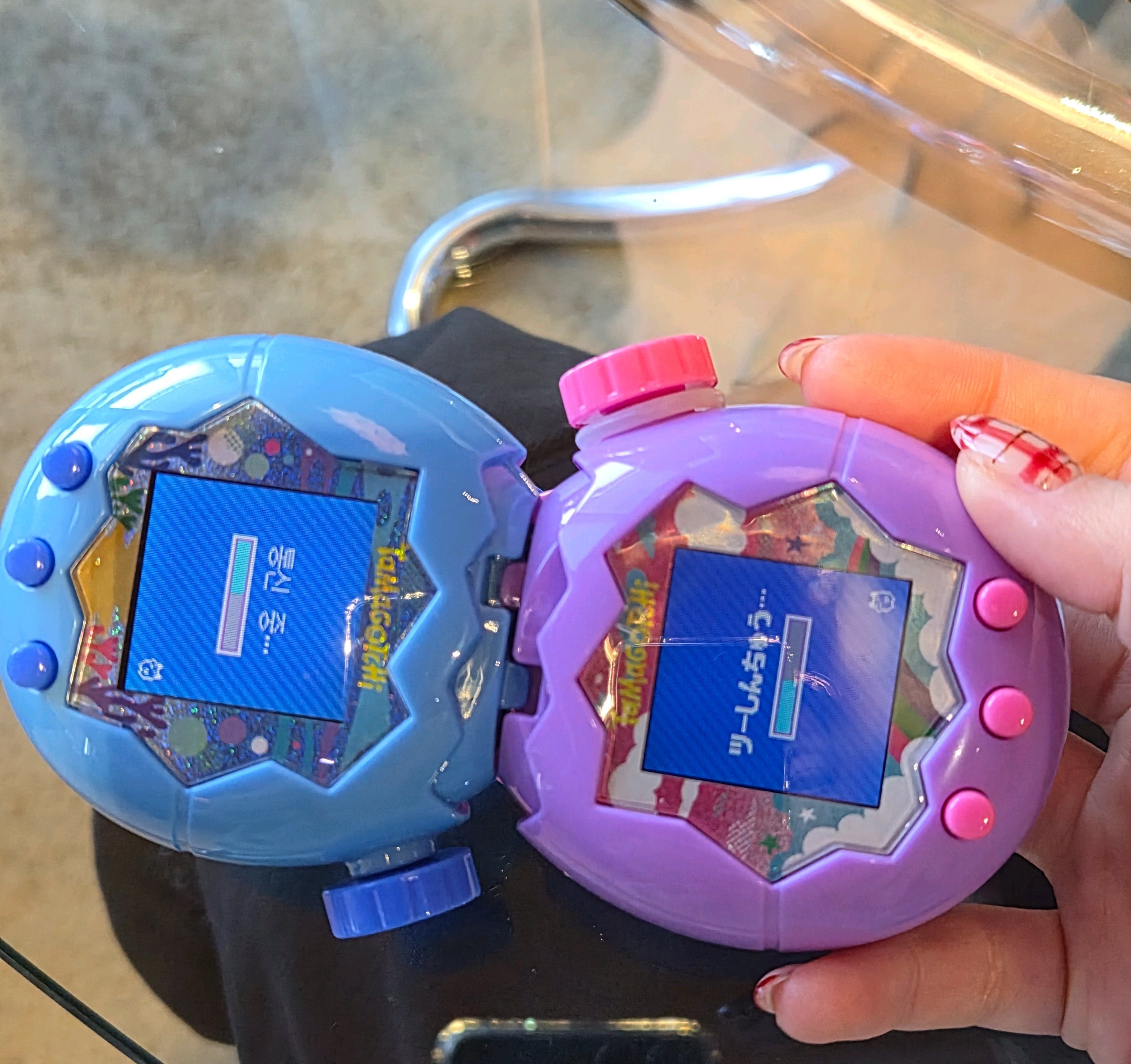 Sakura DM : by the way i tried connecting today: with me and my manager's tamagotchi hehe: []: but they didn’t get along at all....: so sad.....: guess they just weren’t each other’s type... heheadult woman pushing 40 still playing with tamagotchi
