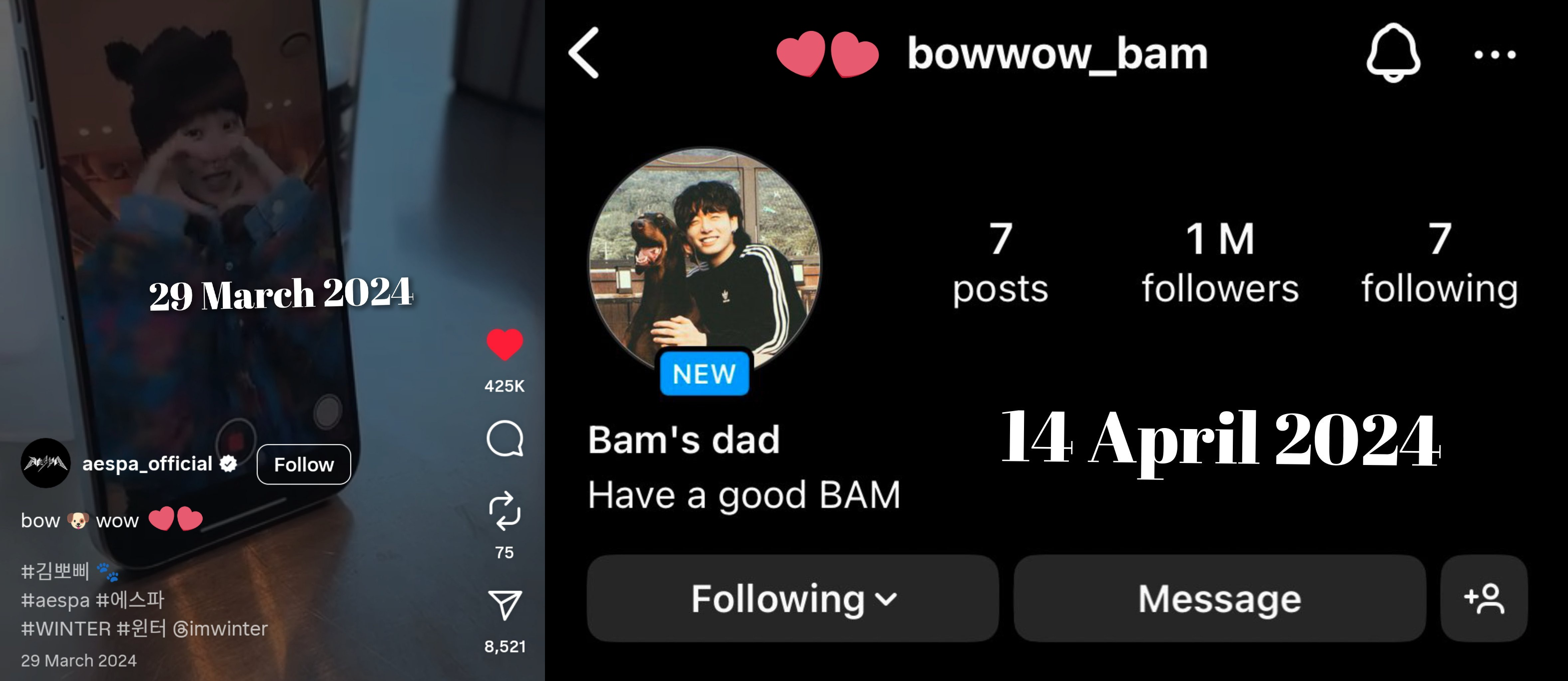 winter made a cryptic post saying bow dog wow2 weeks later jungkook made an instagram for his dog named bowwow