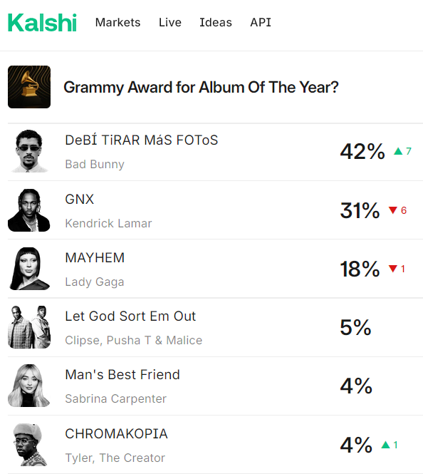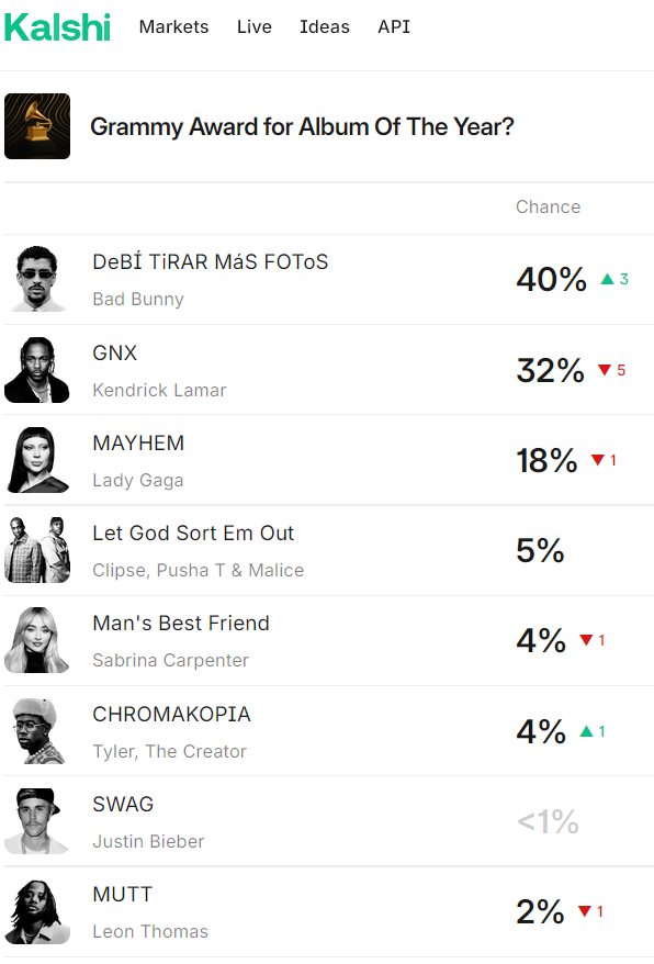>>128834099Bad Bunny winning would cause the most seethe because he would 100% make a speech about Blompf and ICE being nazis. Kendrick winning would not cause any reactions outside of Drake fans I guess. Gaga or Sabrina winning would also cause chud meltdowns I guess because they're women, but I don't think chuds really care about them enough to be angry if the win.