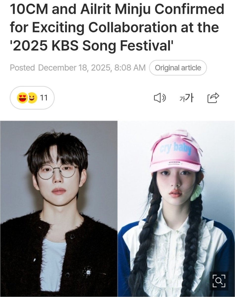 >>128843169[ARTICLE] 251218 — “2025 KBS Gayo Daechukje” 10CM & ILLIT’s Minju Confirmed for a Heart-Fluttering Collaboration Singer-songwriter 10CM and MINJU of girl group ILLIT will present a special duet stage with the song “To Reach You.” This special stage at the 2025 Gayo Daechukje is drawing high anticipation as a meeting between senior and junior artists known for their appealing voices, and is gaining attention as a duet that breaks down generational and genre boundaries.ILLIT’s Minju is a vocalist loved by K-pop fans worldwide for her refreshing tone and solid vocal skills. Through this duet stage, 10CM’s lyrical vocals and Minju’s clear voice are expected to blend beautifully, delivering the overwhelming emotion unique to “To Reach You.”https://www.youtube.com/watch?v=Ry1RrIVyl1M^this is the song10 cm is 42 years old and one of korea's most popular indie musicians
