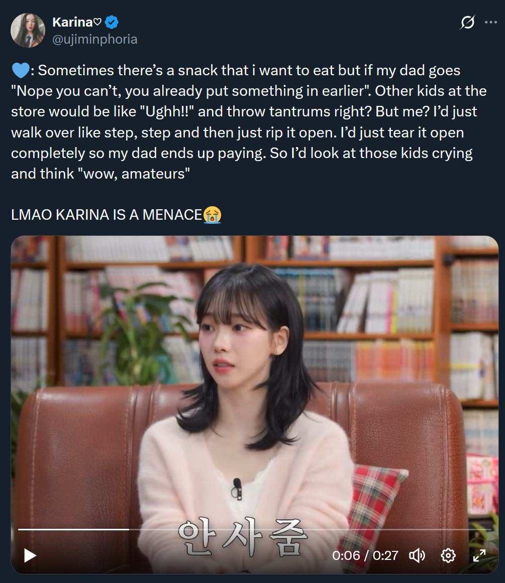 karina is really built different >kicked a lot when she was in her mom's womb that she thought she's a boy>she would bang her head on the floor when she was a baby when things dont go their way>didnt cry & just tore snacks open so her dad cant do anything but to pay for it