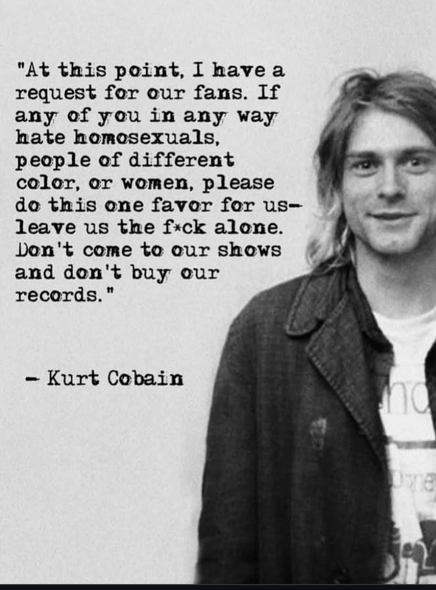>>128850787It’s fine to have an occasional joke at someone’s expense, I don’t think Kurt was above that, and wouldn’t be so puritanical against someone who did joke that way - occasionally. But the problem with jokes and people who joke like that frequently is, they end up believing their jokes. Not to mention it just gets stale after a while. And often times, a person makes these kinda jokes as a way to put people down and make themselves feel better.How could you blame Kurt or any left leaning person for wanting gay people to be treated with respect and without hostility? It was basic decency that many people lacked and still do, however they’re forced behind a computer now.