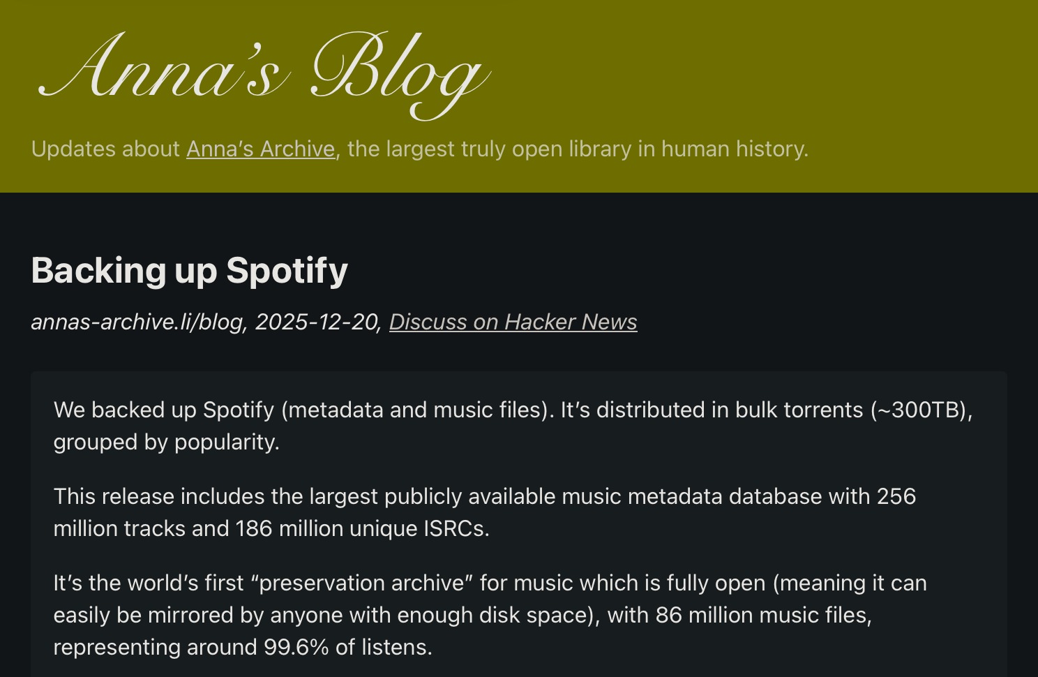 Spotify is now backed up and available for download if you have the disk space:https://annas-archive.li/blog/backing-up-spotify.htmlPretty cool project but I suspect the kind of people who pay for Spotify cannot into torrents.