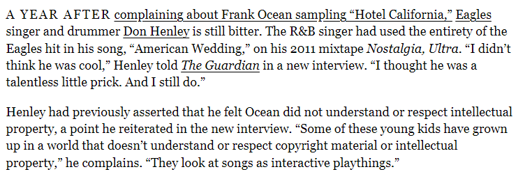 >>128872715>>128874442>the eagles and frank ocean forever turned me off from this conversation>you're just lying, that frank ocean song was greatYou can't be serious, it wasn't even sampling, it was singing over the actual track