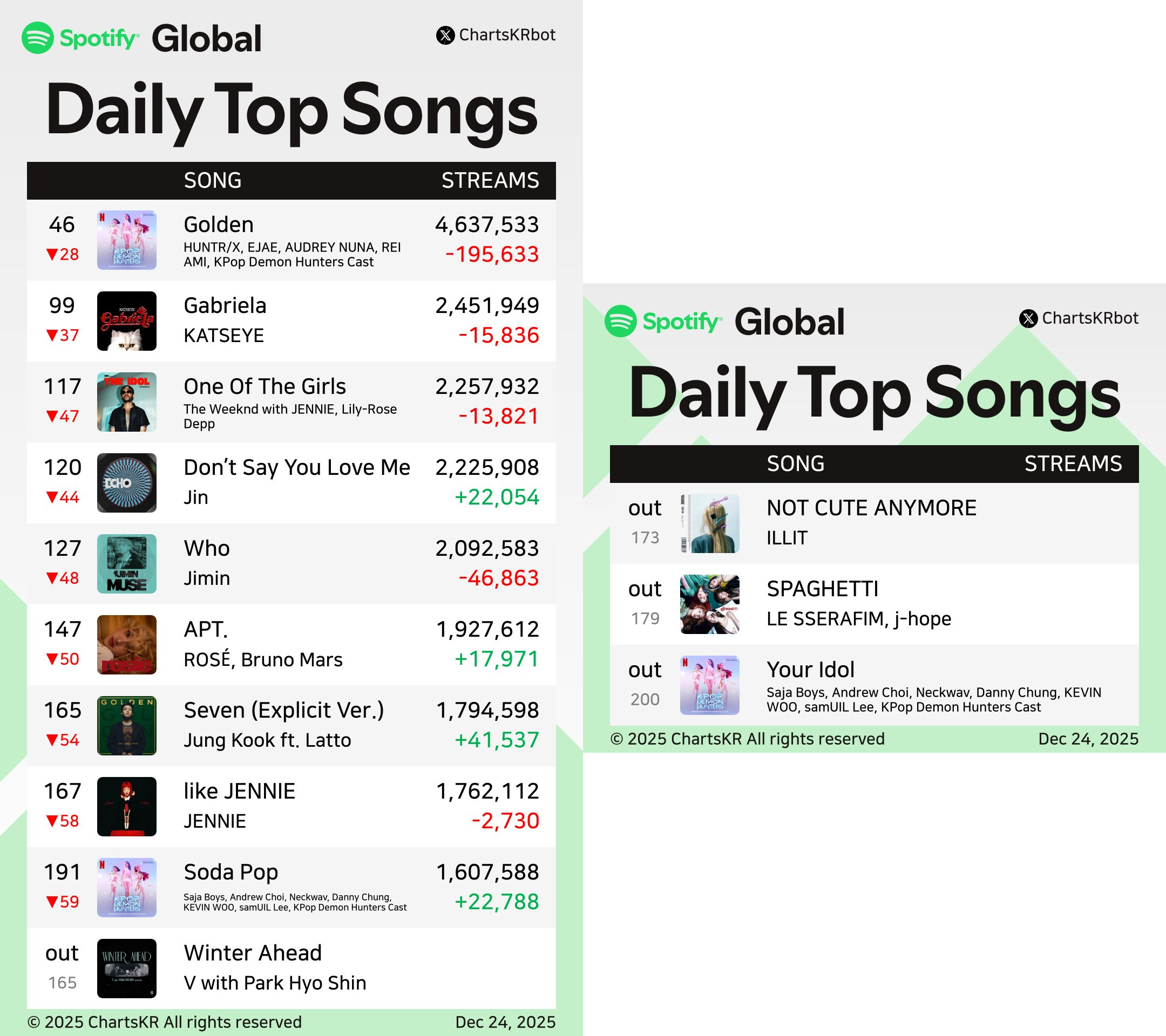 christmas is brutal for artists, especially kpops entry barrier in the top 200 rose from 1.3 to 1.6 million, most non christmas songs saw huge drops (50 positions) and even more songs are expected to go OUT tomorrowonly katseye, netflix and the soloists with the most schizo fans will survive the 25th