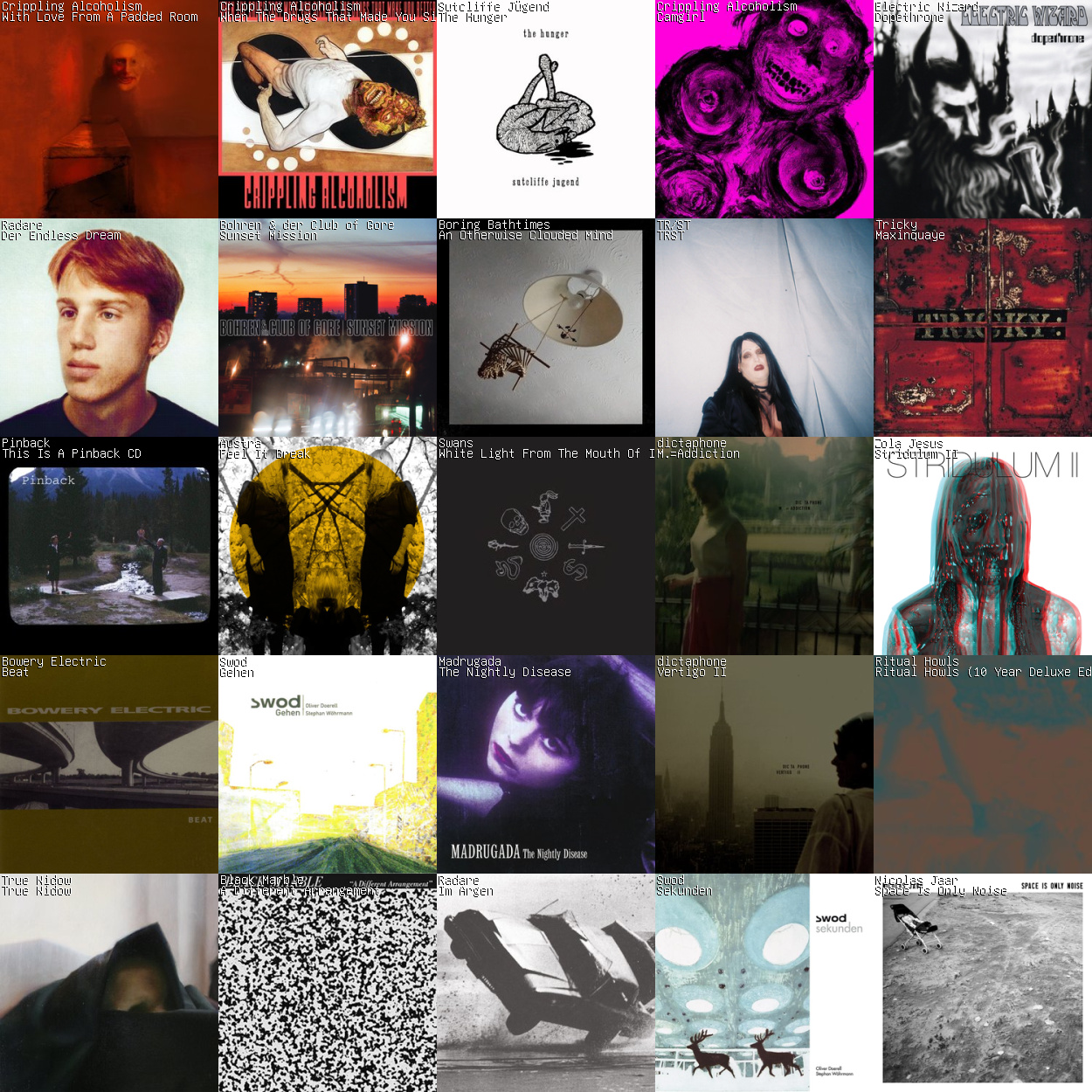>>128945967Are you young? I listened to a lot of QOTSA in my 20's then stopped.>>128947473This Bowery Electric is a classic, changed my life years ago. You may like Monoland - Cooning (2001)I finally got into this Tricky. Liked Pre-Millenium Tension before and also a big fan of Massive Attack. It was a pity I couldn't go to their concert this year.Not so dark but you can like Mathias Grassow & Thomas Weiss, Christina Vantzou. Ian William Craig on a more glitchy side.Really dark i like 2 OSTs: Disasterpeace - It Follows and Mica Levi - Under the Skin>>128947494It's very good. There is a 15 minute short doc about its production. At least 8 tracks are phenomenal. I love Catherine and Jupiter