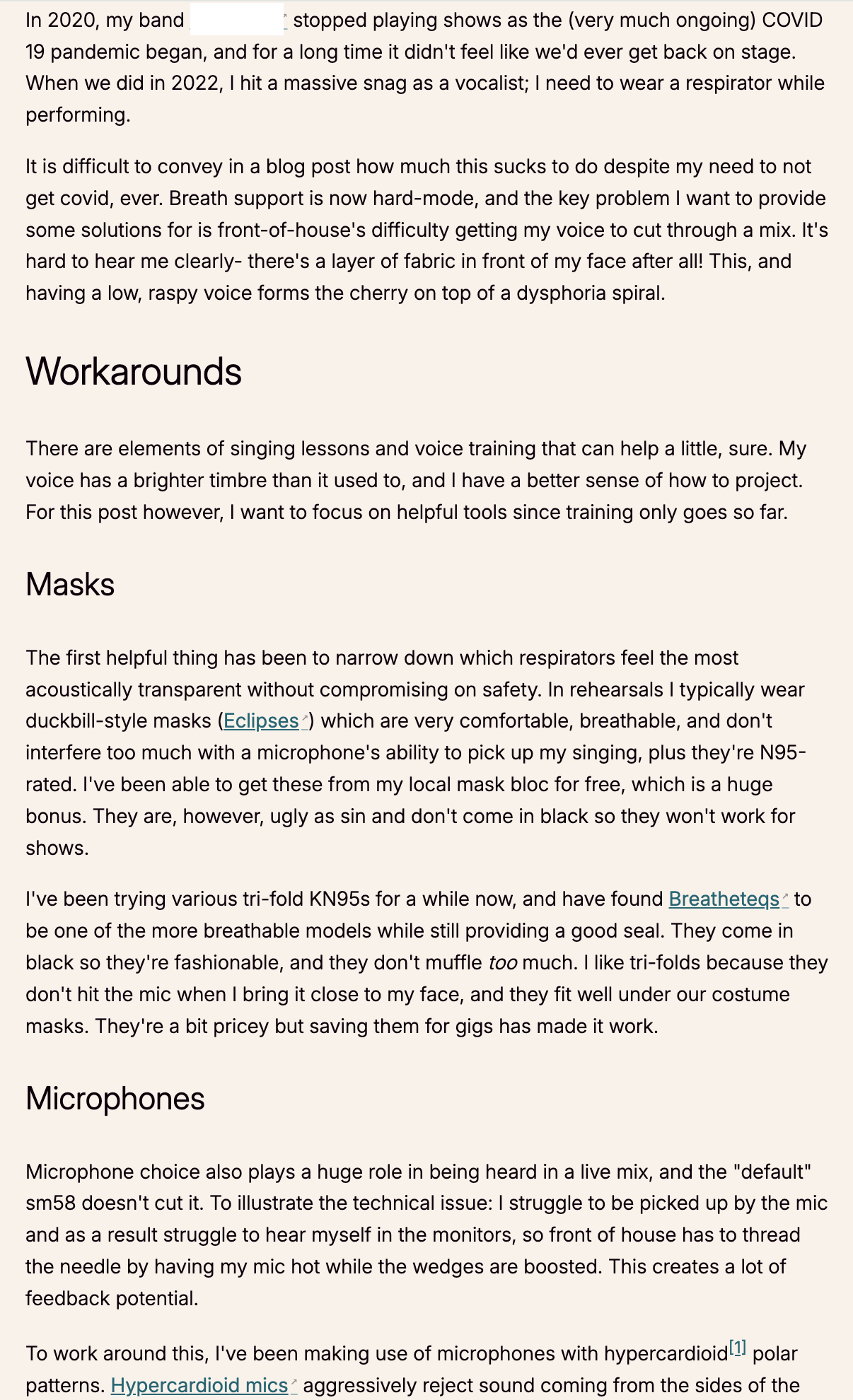 fave bands that rightfully acknowledge we're in a very much ongoing pandemic and can recommend the most acoustically transparent respirator masks for live performances? >The first helpful thing has been to narrow down which respirators feel the most acoustically transparent without compromising on safety. In rehearsals I typically wear duckbill-style masks (Eclipses) which are very comfortable, breathable, and don't interfere too much with a microphone's ability to pick up my singing, plus they're N95-rated. I've been able to get these from my local mask bloc for free, which is a huge bonus. They are, however, ugly as sin and don't come in black so they won't work for shows.>I mostly wanted this post to focus on ideas and solutions to a struggle that has been demoralizing and isolating.[4] To be a vocalist who practices covid safety in 2025 is to exist in the periphery, clawing at scrap opportunities to be heard while disadvantaged in ways your music scene peers aren't.