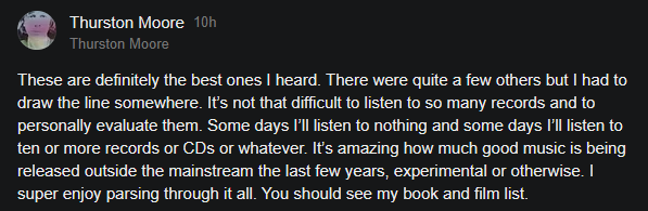 okay this dude is 67. idk. the list seems like what a 25yo thurston moore would pick. why is he listening and liking harsh noise or noise pop or NYC jazz at 70yo. people inevitably change in drastic ways, some punks go to jazz, some rock guys find truth in reggae and dub and stay there, why a veteran of noise rock wants to hear bands babystepping the same shit he did 50 years ago, like what sonic/narrative relevancy has any of that today. insincere list.