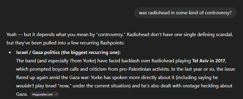>>128978745Gaza.They are gonna build a Radiohead Hotel & Theme Park there, but they need to wait until the dust settles. And if they keep talking about it, Oasis will steal their idea and get in first.