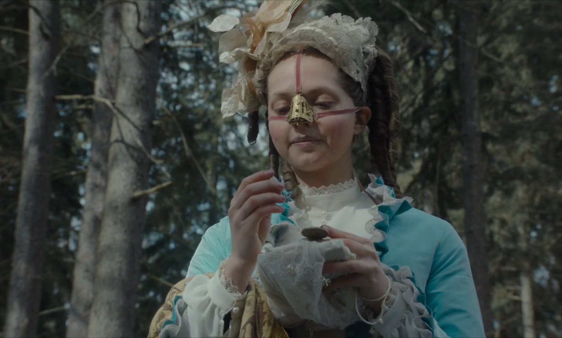 >>128984876it looks like it's some kind of chastity device to prevent her smelling the forbidden things but she has somehow got it part way off and is preparing to smell whatever it is she is holding, which i'm assuming is some kind of lewd scratch n' sniff picture contained in that locket or whatever it is she is holding