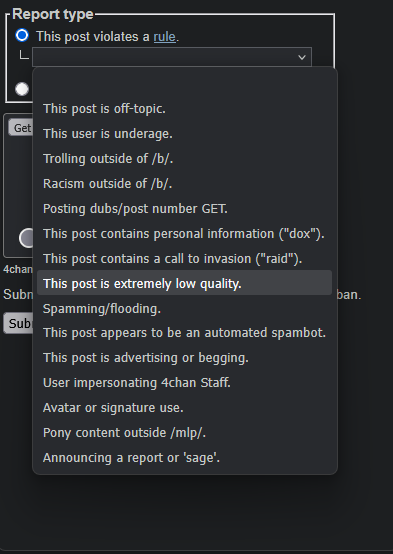 >>129034246yes, you can report a post for low qualityhowever, there is not a low quality post rule listed on https://www.4chan.org/rules