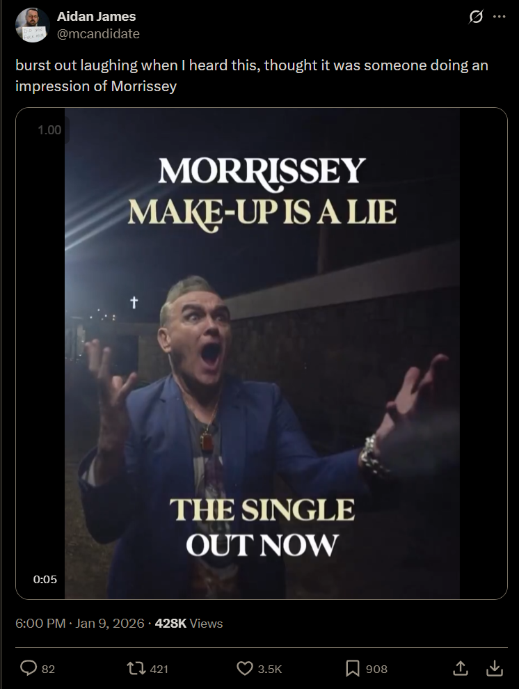 New single isn't great but not the worst thing ever like people are saying, weird for a lead single>>129072385His recent setlists have been good, hope he doesn't change it. I'm seeing him in London (if he doesn't cancel lol) and I'm kind of worried he's going to play a lot of this album now. Let's hope it's better than the single>>129062931Seems bonfire will probably also be released this year >please sit in your favorite chair in your dark cabin with the lights out - or, get off your head and enjoy some impulsive self-humiliation - as I often do. I hope you consider Make-up is a Lie to be worth the attention that you give it. Many of us, here, and in France, Turkey, Poland, The Netherlands, Denmark, Greece, America, England … we have waited because our belief is unchallengeable: let the squawkers squawk. What survives beyond their grasp is love. I insist on being myself in spite of much discouragement, and this new music is a valid portrait of much more to come in 2026. Born, then born, and born again. I am your lover-to-be, MORRISSEY.