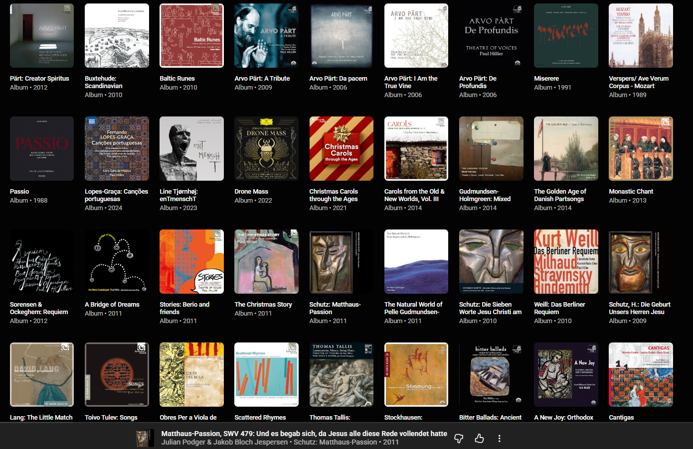 Discographies like Paul Hillier's fascinate me. It's a mix of super early, pre orchestral/pre Bach and modernist choral music. You've got Schutz yet Avro Part, Tallis yet Kurt Weill, Lassus and Cornago (whoever these Renaissance guys are) yet Lopes-Graça and Stochkhausen. Wild. I love it.thishttps://www.youtube.com/watch?v=69bAy9vzjCc&list=OLAK5uy_kGwQIn8R_9XcuJ9eJT0SfvoVypdyyaDew&index=2and this (damn this is awesome actually)https://www.youtube.com/watch?v=F92wM0QpDTw&list=OLAK5uy_kYjT2yVDKYkaVA97GNm5SSjxYBVR1GqH0&index=12I guess when you love the sound of the human voice that much, everything else is secondary.