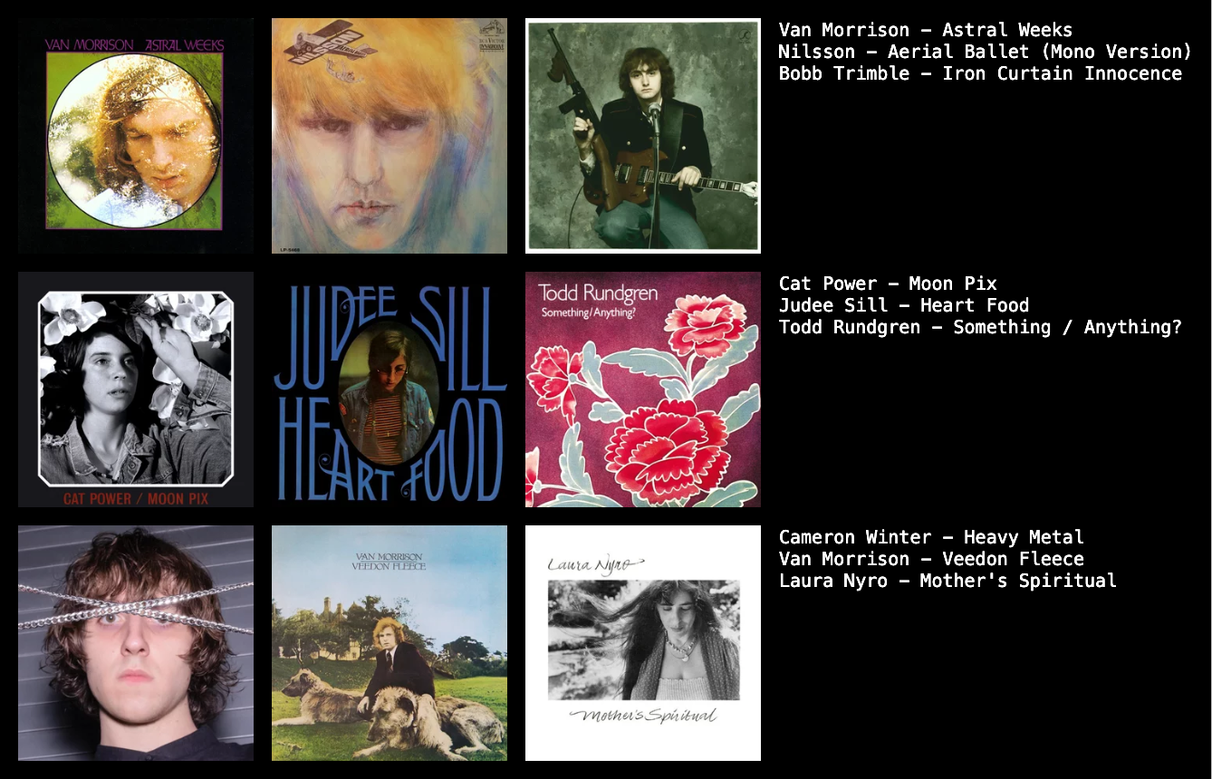 It's fun seeing the albums that people connect. These albums are pretty broad aside from mostly being some version of late 60s or 70s singer songwriter.