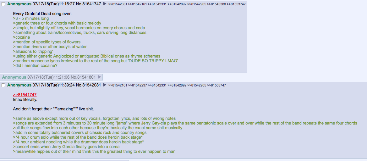 >>129088547Don't listen to this retard. What you said here is a 100% fact-checked True fact about jam bands:>people who smell like ass think it's smart