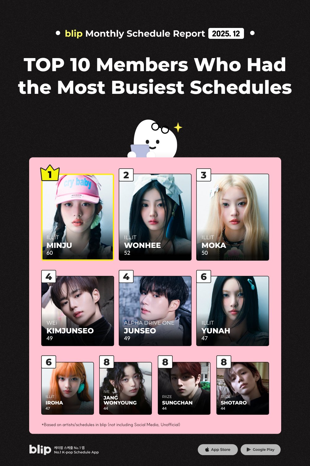 blip Monthly Schedule ReportTOP 10 Most Booked K-Pop Members in December 1 #1 MINJU #ILLIT2 #2 WONHEE #ILLIT3 #3 MOKA #ILLIT4 #4 KIMJUNSEO #WEi4 #5 JUNSEO #ALPHADRIVEONE6 #6 YUNAH #ILLIT6 #6 IROHA #ILLIT8 #8 JANGWONYOUNG #IVE8 #8 SUNGCHAN #RIIZE8 #8 SHOTARO #RIIZE*Based on artists/schedules in blip(not including Social Media, Unofficial)