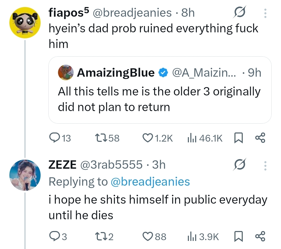 >>129139293sui is the hottest kiiikiii, why does kpg barely ever post her?>>129139294people can cope all they want but lee jinho has been right about everything and the things he said (they had already split in two groups months ago) are proving to be true, so what he said about the other members losing their trust in her after she went for the omega deal alone and even worked with ador is probably true. if you look at the timeline everything makes sense: they lose trust in her and start moving independently too > hyein's dad starts gaining influence again -> she starts planning her solo career and HH go back -> she releases a statement in mdh's name without asking hanni -> it's the final straw for hanni and she goes back alone