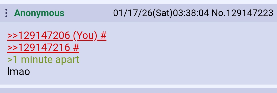 >>129147206>>129147216>1 minute apartlmao