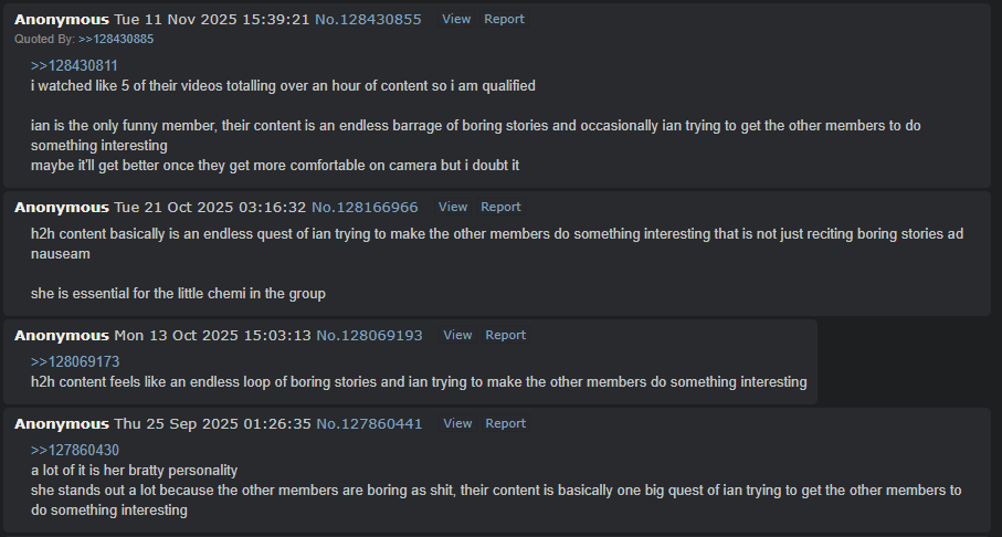 >>129197696>>129197708>>129197714how is this badi have been consistent in my opinioni dont spam crops or call the girls ugly, i dont hate the girlsi call their content boring when the topic comes up, because it's true, their content is boringyou guys need some thicker skin>>129197720i have watched hours of their content