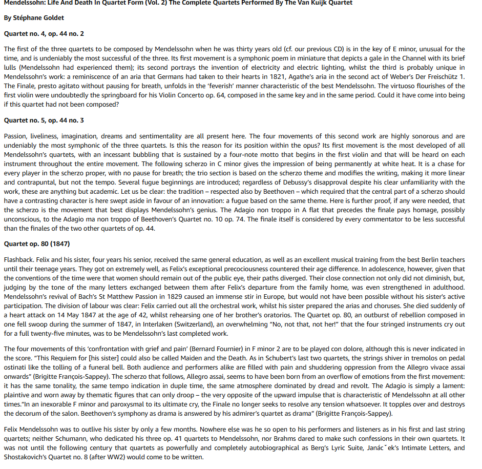 now playingstart of Mendelssohn: String Quartet No. 6 in F Minor, Op. 80https://www.youtube.com/watch?v=J6X5kxug9k8&list=OLAK5uy_mcGed3kZYOY4OJgiKtjR9MST-PpGQnM1Q&index=2start of Mendelssohn: String Quartet No. 4 in E Minor, Op. 44 No. 2https://www.youtube.com/watch?v=_fDHHnusLO4&list=OLAK5uy_mcGed3kZYOY4OJgiKtjR9MST-PpGQnM1Q&index=6start of Mendelssohn: String Quartet No. 5 in E-Flat Major, Op. 44 No. 3https://www.youtube.com/watch?v=6ZDptWWoNNg&list=OLAK5uy_mcGed3kZYOY4OJgiKtjR9MST-PpGQnM1Q&index=9