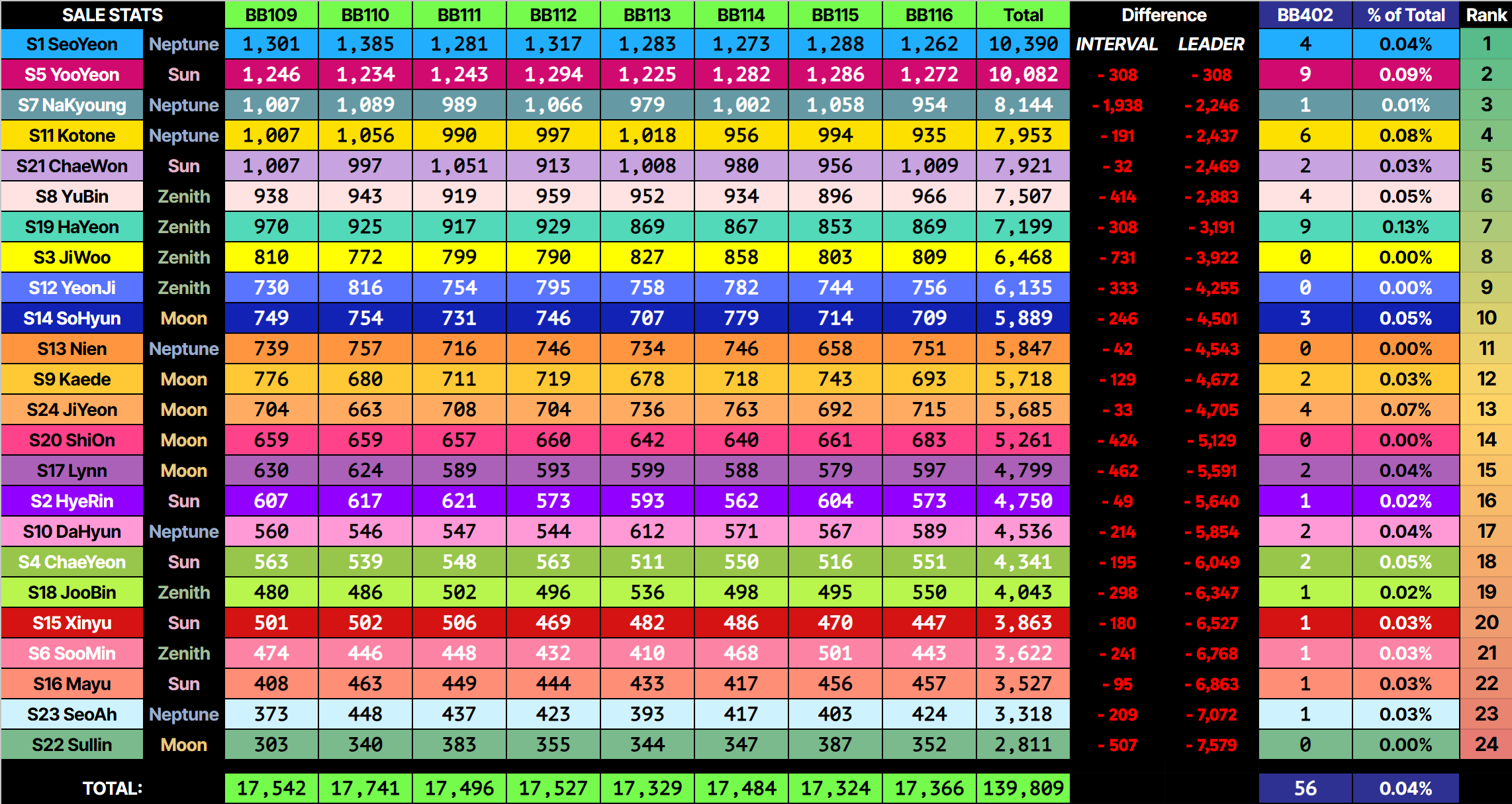 Binary02 2nd Edition 1st Day Sales (OT24):>Sorted highest lowest:Seoyeon – 10,397Yooyeon – 10,083Nakyoung – 8,148Chaewon – 7,989Kotone – 7,973Yubin – 7,511Hayeon – 7,239Jiwoo – 6,478Yeonji – 6,143Sohyun – 5,917Nien – 5,863Kaede – 5,722Jiyeon – 5,693ShiOn – 5,269Lynn – 4,808Hyerin – 4,760Dahyun – 4,536Chaeyeon – 4,348Joobin – 4,043Xinyu – 3,867Mayu – 3,539Seoah – 3,334Sullin – 2,827Soomin – 1,772