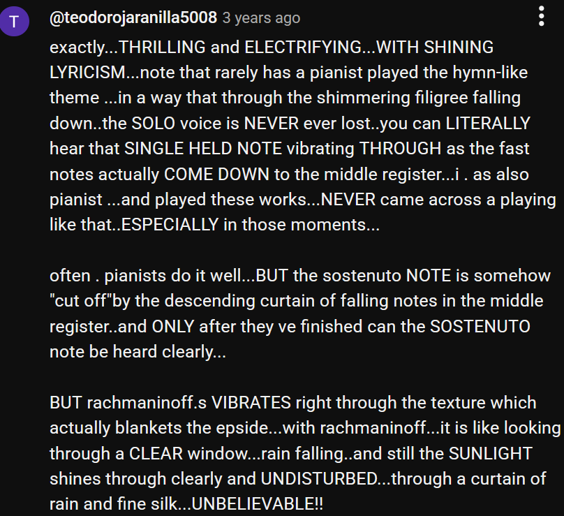 >>129228207Ah, I believe he recorded some Alkan on an Erard as well - which is always preferred over the modern grand piano - I like that he actually cares about such things. Its very disgraceful that pianists play everything from Mozart to Beethoven on modern grand pianos that literally cannot keep up with the compositions because it was written for fortepiano which has a lot more clarity. I'm still warming up to Maltempo after I disliked his Skrjabin 4th, but hes much better than some pianists I've listened to. This nocturne for instance was very good, maybe I'll give his Skrjabin cycle another shot. >>129228238True, it does not SING like Cotot, where are the WRONG NOTES, where is the schmalzy overblown RUBATO, the completely made up RHYTHMS? He should listen to the OLD MASTER to hear how to play piano https://www.youtube.com/watch?v=7qAYv5c6-Lc
