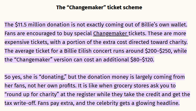 >>129253552>Then it's why aren't they donating their own money insteadNever happened. Her fans literally paid for it via increased ticket pricing on top of what they paid her. She even apologized for the "confusion" after getting called out.