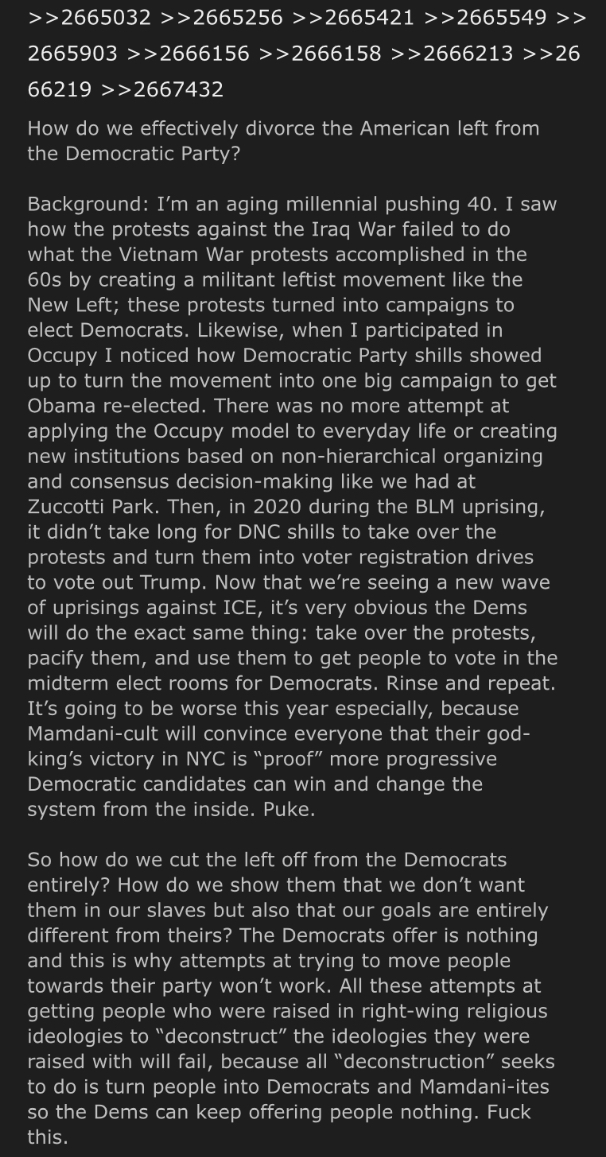 >>129260131Building a strong, competent American left that is entirely autonomous from the Democrats and that isn’t constantly shilling for “good” Dems like Mamdani or AOC.