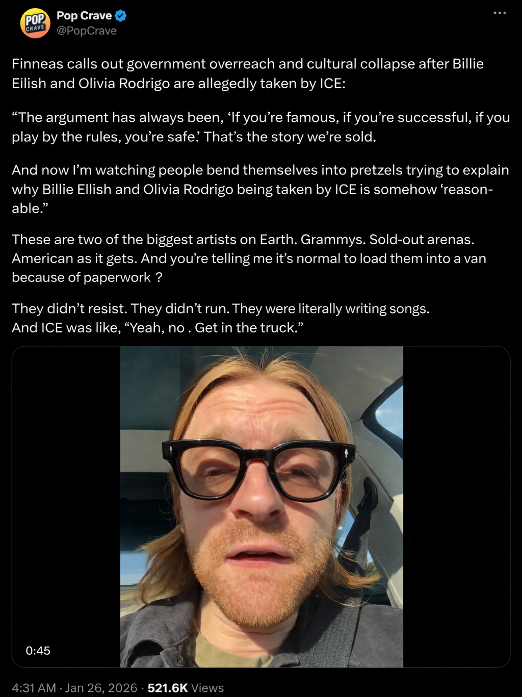 >In his video, FINNEAS argued that many conservative arguments surrounding school shootings revolve around the “un-fucking-believable argument” that the right to bear arms must be protected even at the cost of children’s lives. “Every argument I’ve seen for why Alex Pretti’s death was justified yesterday is like, ‘Well, he had a gun.’ Shut the fuck up! You’ve spent 30 years straight telling us that children have to die so that we’re allowed to legally carry weapons everywhere in the United States,” FINNEAS contended.