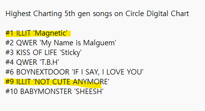 ILLIT's NOT CUTE ANYMORE moves 2 positions up to a new peak of #9 on the Circle Chart, becoming ILLIT's second song to enter the top 10.ILLIT and QWER are now the only 5th gen girl groups with multiple songs charting in the top ten bracket on Circle.