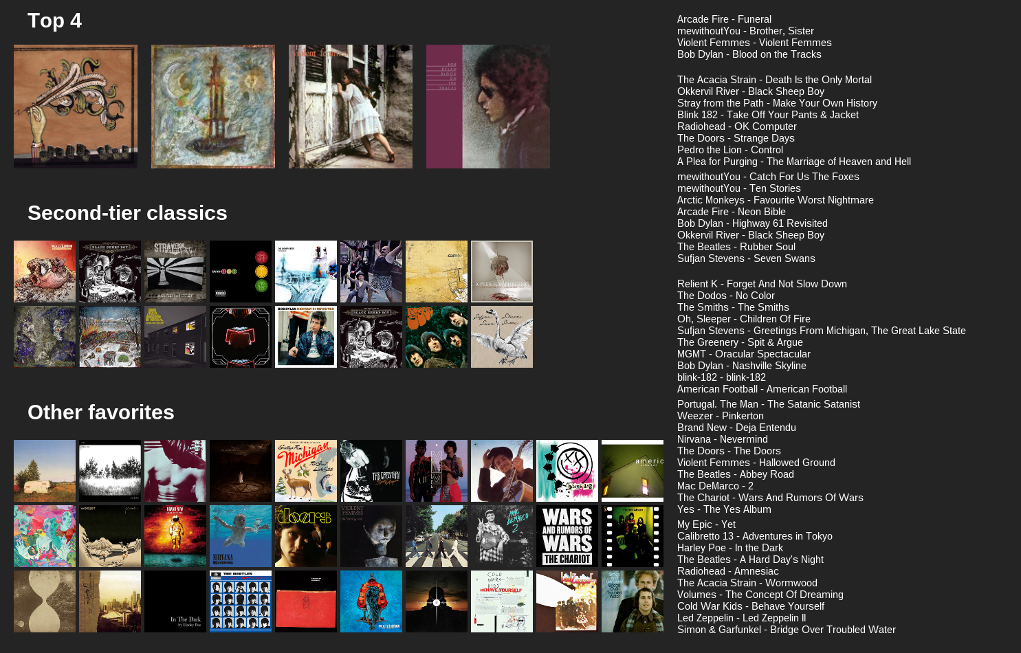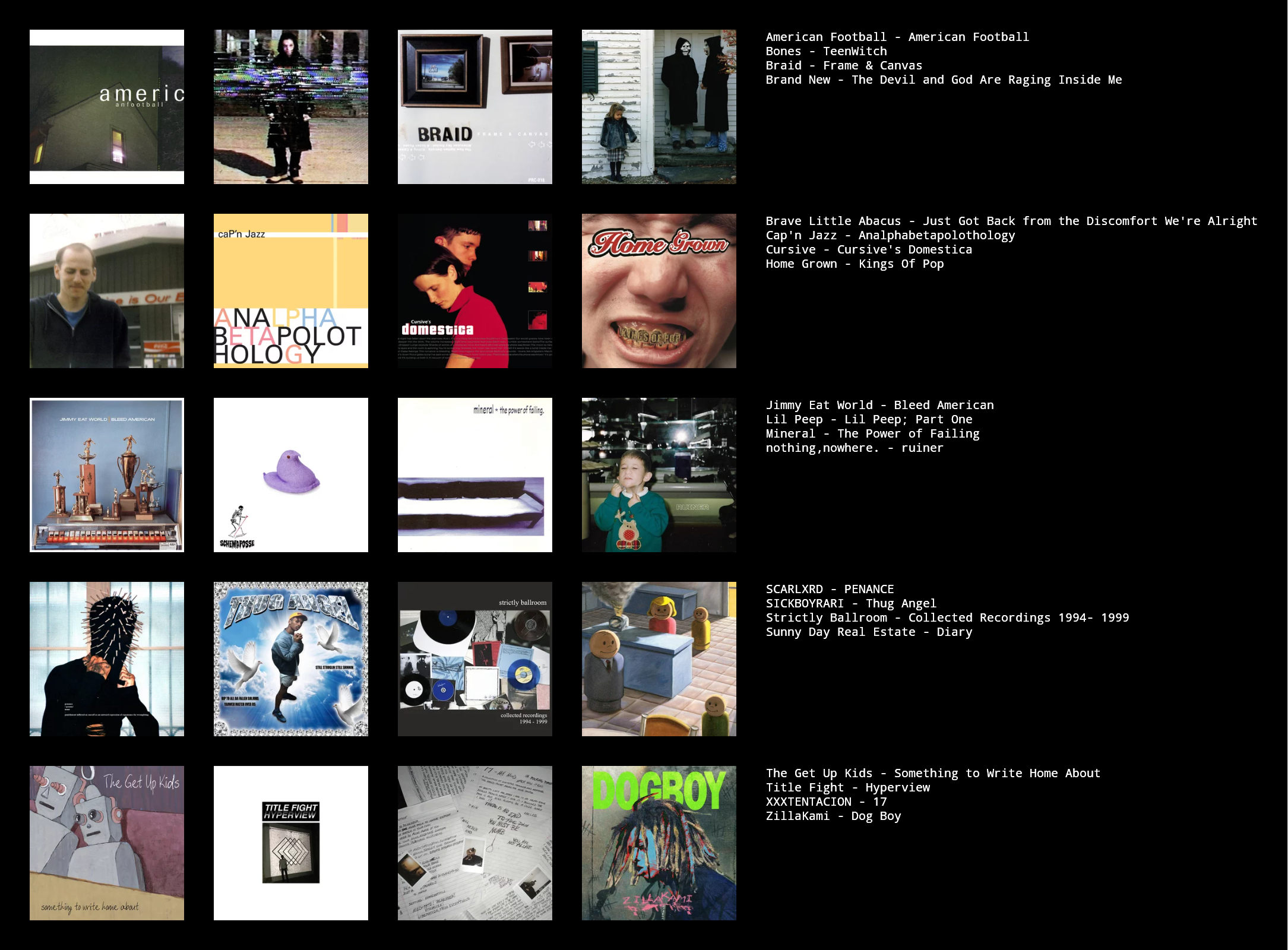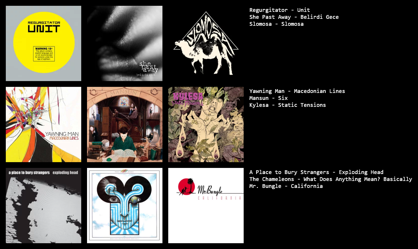 These are just my recent favourite listens, any recs appreciated.>>129282433Moon Safari by Air is pretty classic if you haven't checked it out, otherwise give Movements by Booka Shade a listen.>>129282561Sick chart, rate Sunny Day, and The Get Up Kids highly. You might like some of the tracks of Not Accepted Anywhere by The Automatic. I think as a whole the album can drag, but a few tracks in their discog are worth scraping out. Otherwise, United by Fate by Rival Schools or Menos El Oso by Minus the Bear are pretty good, but you might have heard em already.