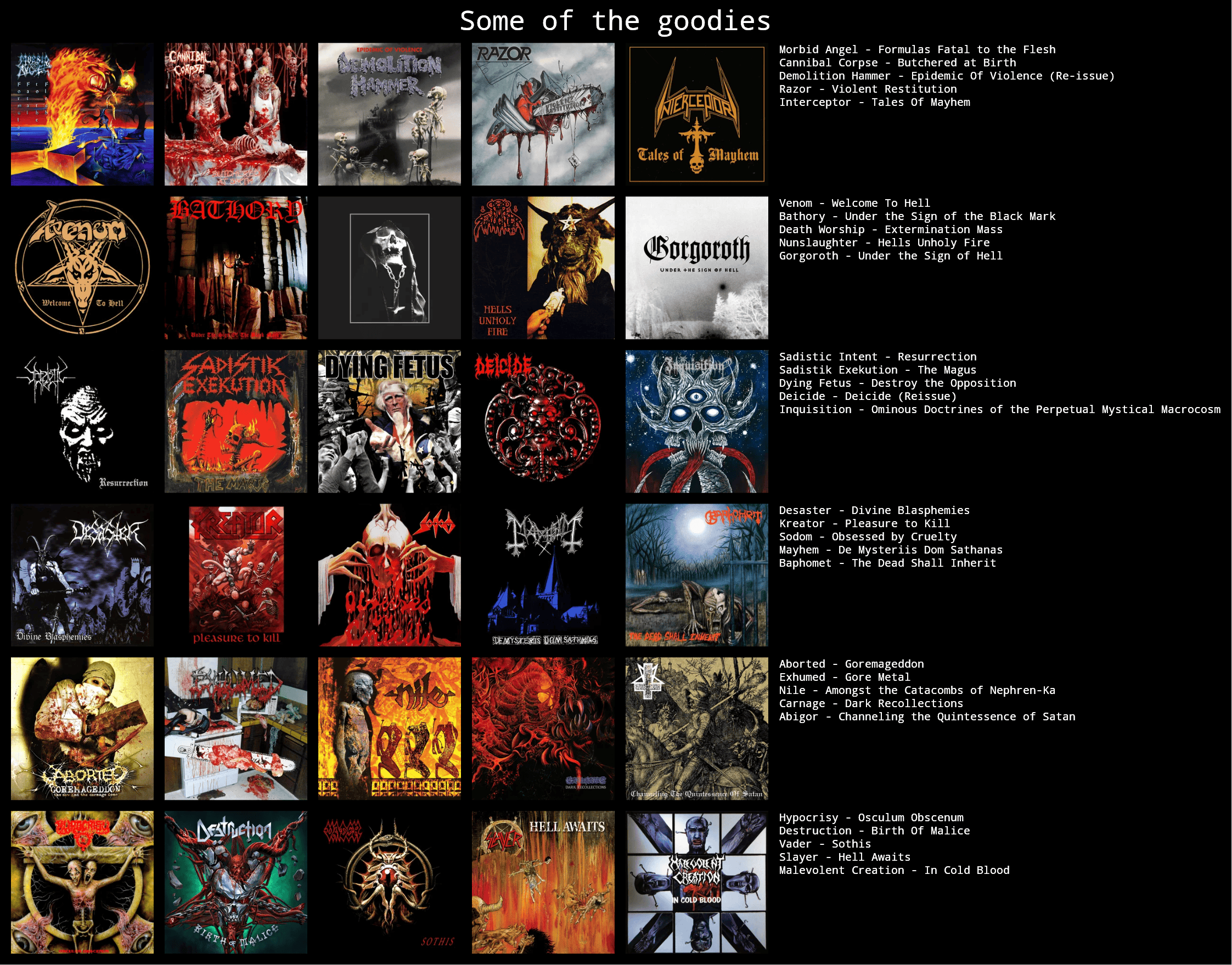 >>129295751>Demolition Hammer>Venom>Bathory>Nunslaughter>Gorgoroth>Sadistik Exekution>Deicide>Inquisition>Kreator>Sodom>Baphomet>SlayerAll very based. A bit too much entry-level Death Metal, though. Try including more Death Thrash like Incubus/Opprobrium, Ripping Corpse, Num Skull, Protector or Poison (Germany). As others mentioned, cult Death Metal like Infester would work, too.