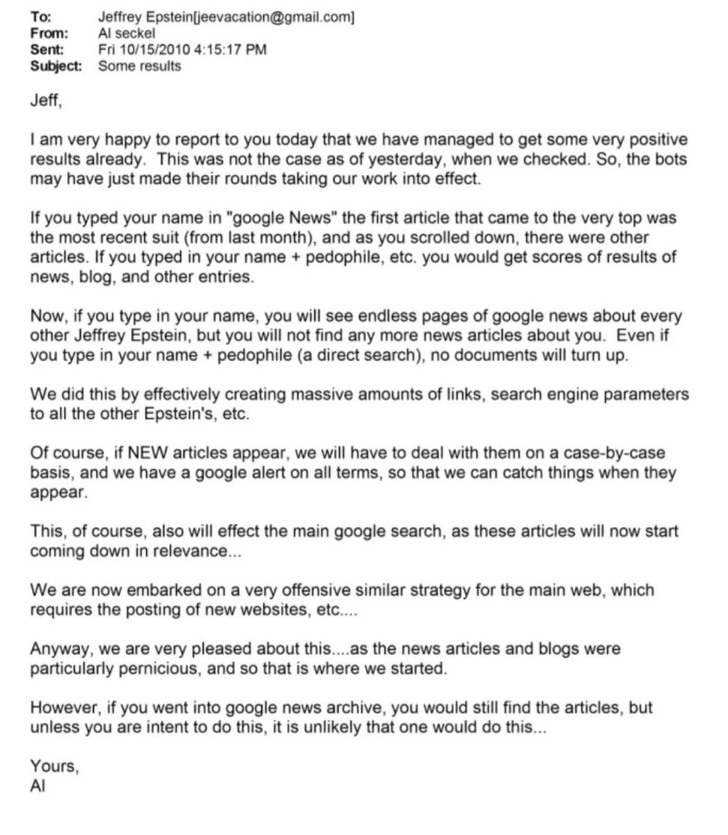 isn't this the same as TAG PR did>An email to Epstein in 2010 that describes deliberate search-engine manipulation to bury reporting on his crimes. They boosted "all the other Epstein's" to bury any direct searches for his name + pedophile. This is clear evidence of coordinated, deceptive reputation control.https://x.com/davenewworld_2/status/2018742766780514540