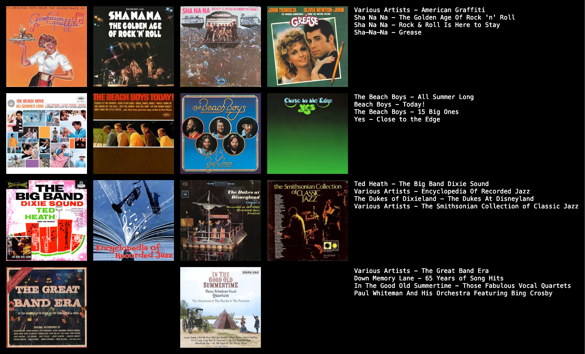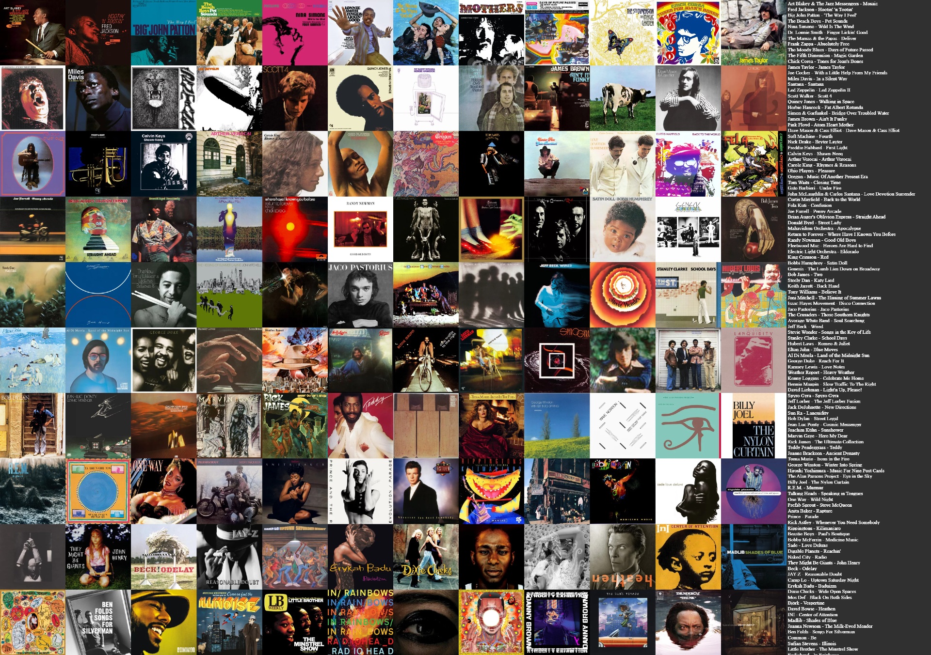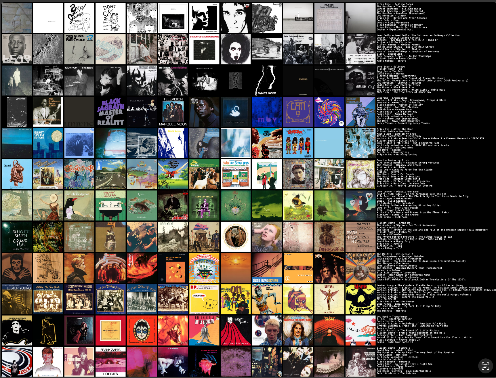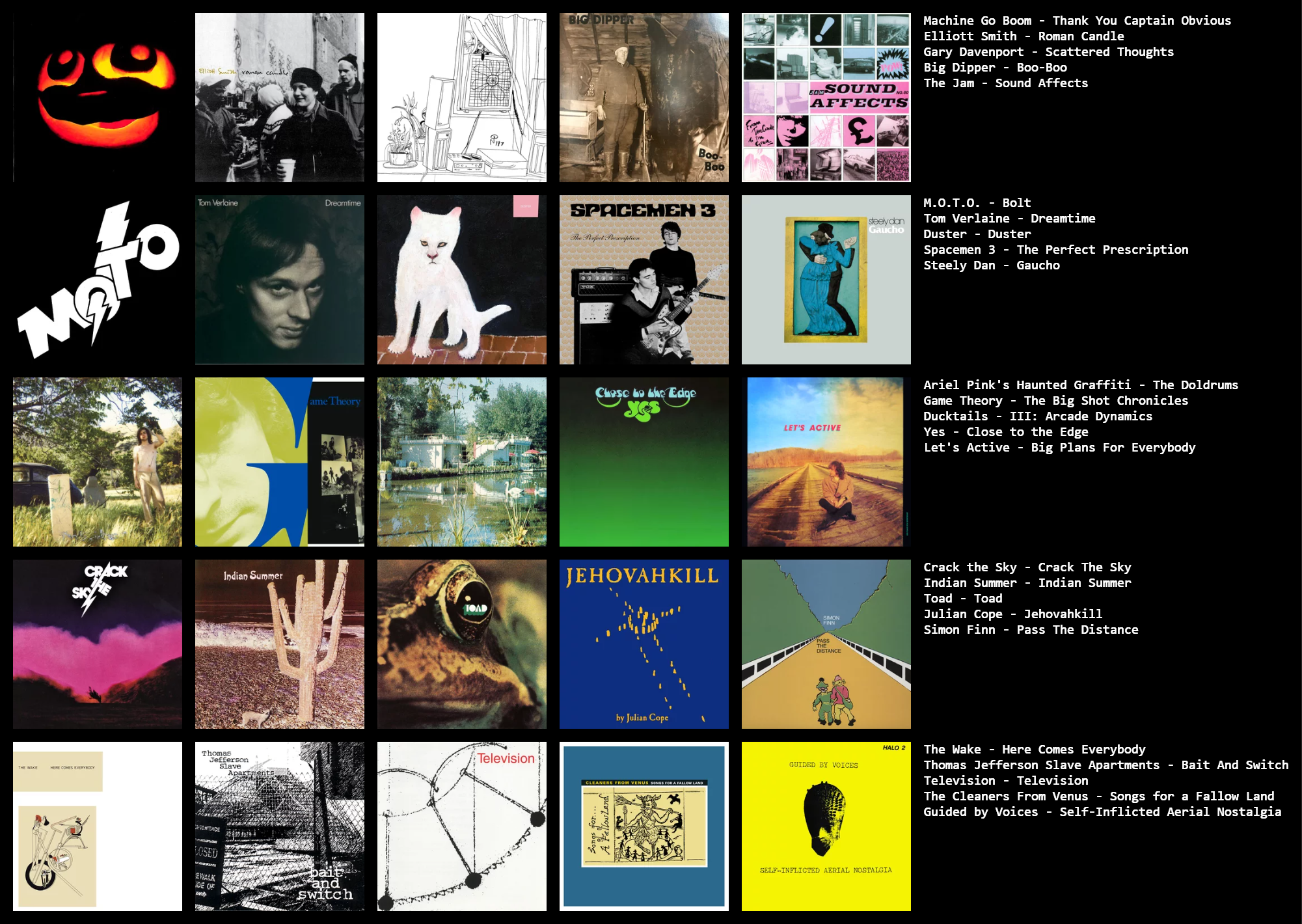 FINALLY managed to get the image to a proper file size. Let's do this: >>129469343Half of these don't even look like real albums. >>129469361Already complimented you yesterday but still: amazing taste. I'd maybe cut out the duplicate artists but otherwise love it. >>129470735All the rooms in your house smell like a smoking grandma. >>129470760You walk with unwavering confidence and swagger. You own a leather jacket in every color. Owns glasses that may or may not be prescription.