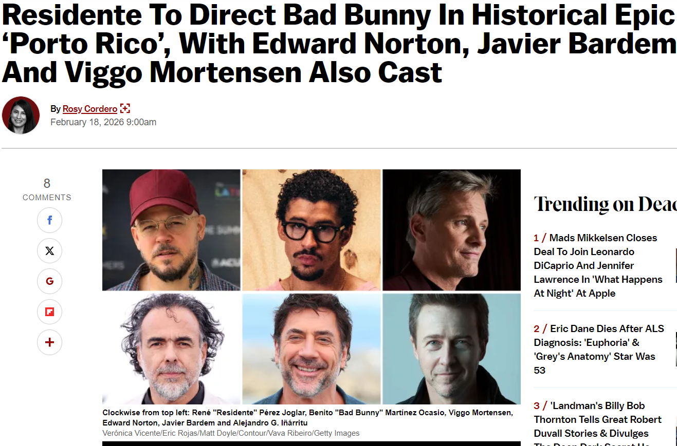 >The film, titled Porto Rico, is an epic Caribbean western and historical drama led by Benito “Bad Bunny” Martínez Ocasio (Bullet Train, Caught Stealing) in his first leading film role. The main cast also includes Viggo Mortensen (Eastern Promises, Captain Fantastic), Edward Norton (American History X, Birdman) and Javier Bardem (No Country for Old Men). Multi-Oscar-winning director and producer Alejandro G. Iñárritu executive produces.