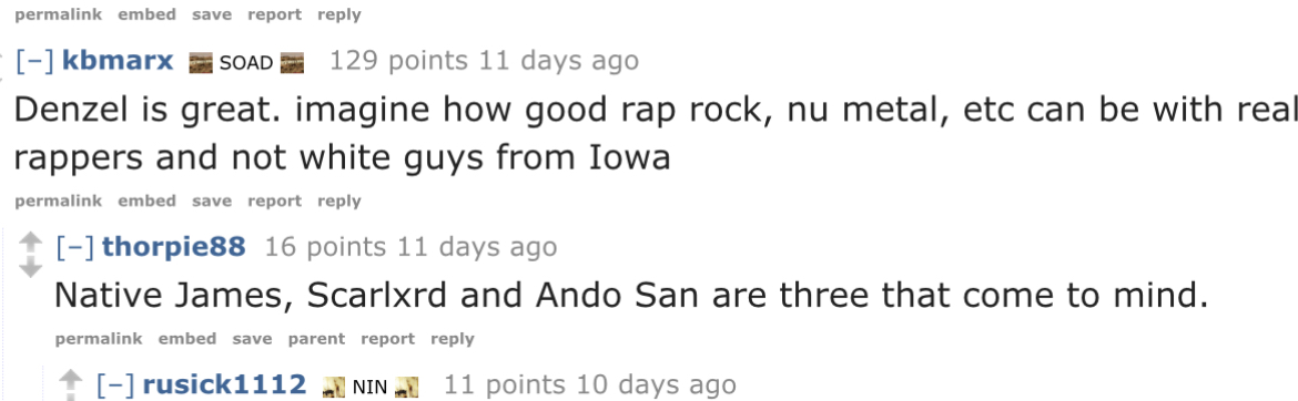 >>129496097r/metal is basically dead. not sure why it’s just a ghost town. r/MetalForTheMasses is where the people who you think of when you hear the word redditor congregate to talk about metal even tho most of them seem to hate 99% of it for being problematic (even a band like Megadeth is considered problematic to them), and instead hype up bands like knocked loose and spiritbox