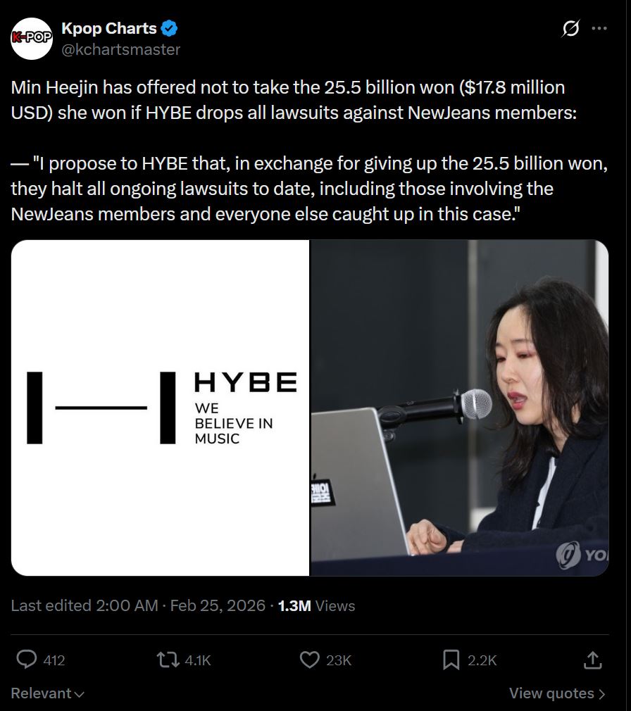 >I propose to HYBE that, in return for relinquishing the 25.5 billion won, they cease all lawsuits currently in progress to date, including those concerning the NewJeans members and everyone else involved in this matter.>I can no longer endure seeing members who ought to be joyfully performing on stage instead appearing in a courtroom. Neither the members on stage nor the fans can feel happy witnessing this situation.Were Tokkis right all along?