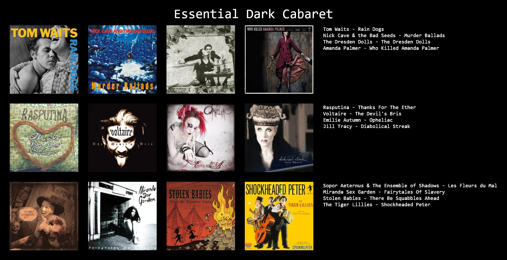 >>129595729>Emilie Autumn was in that same 90s baby musical ecosystem as Voltaire, Amanda Palmer, Panic! At The Disco, and even Mindless Self IndulgenceMy take is that, besides being in the same circles and sharing an aesthetic, her music has very little of "Cabaret" in it, same with Rasputina.>the first album doesn't have a lot of valueI can see that Enchant was kind of a hodge podge mixture of genres, but I wouldnt say it doesnt has value. (also How Strange is NOT even in the top 5 of that album)