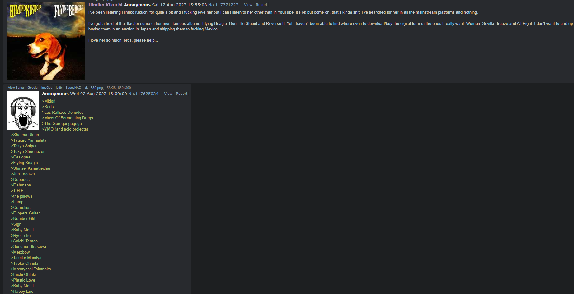 >>129576636he means that dog album made him press F5 so a better Jazz Fusion reply appears in the thread, none appeared, therefore anon was disappointed.Praise Casiopea, simple as.